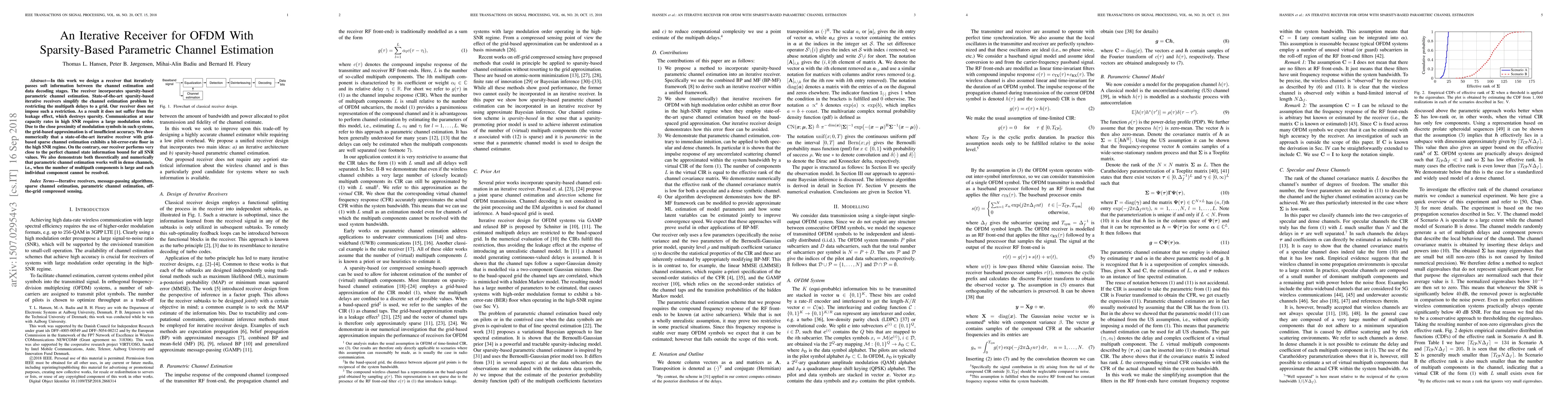 In this work we design a receiver that iteratively passes soft information between the channel estimation and data decoding stages. The receiver incorporates sparsity-based parametric channel estimation. State-of-the-art sparsity-based iterative receivers simplify the channel estimation problem by restricting the multipath delays to a grid. Our receiver does not impose such a restriction. As a result it does not suffer from the leakage effect, which destroys sparsity. Communication at near capacity rates in high SNR requires a large modulation order. Due to the close proximity of modulation symbols in such systems, the grid-based approximation is of insufficient accuracy. We show numerically that a state-of-the-art iterative receiver with grid-based sparse channel estimation exhibits a bit-error-rate floor in the high SNR regime. On the contrary, our receiver performs very close to the perfect channel state information bound for all SNR values. We also demonstrate both theoretically and numerically that parametric channel estimation works well in dense channels, i.e., when the number of multipath components is large and each individual component cannot be resolved.