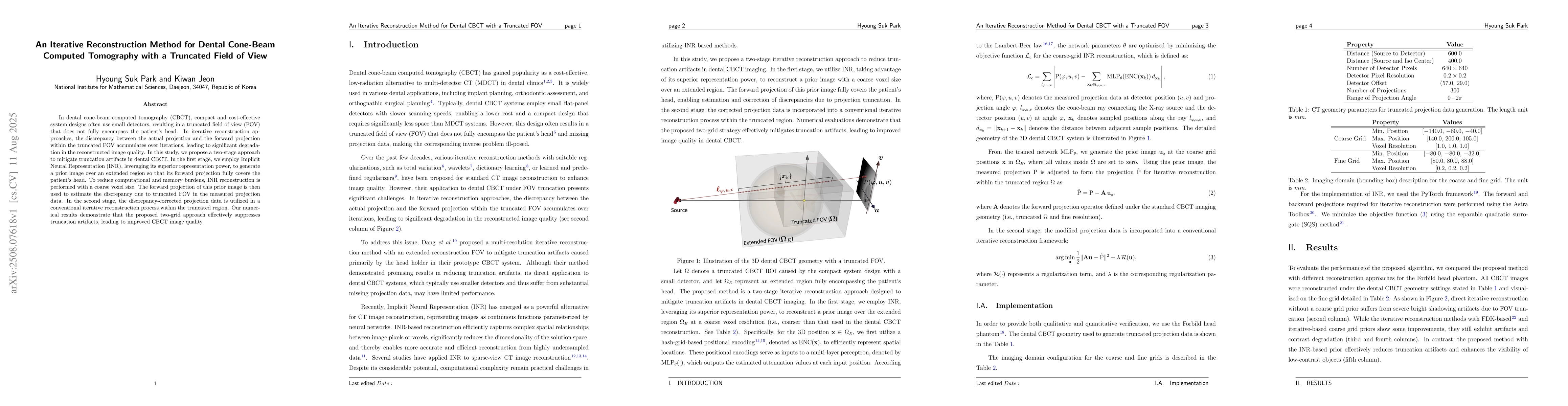 The research proposes a two-stage iterative reconstruction approach for dental CBCT with a truncated field of view. It uses Implicit Neural Representation (INR) to generate a prior image over an extended region, then corrects discrepancies due to truncation in the measured projection data. The corrected projection data is used in a conventional iterative reconstruction process within the truncated region.