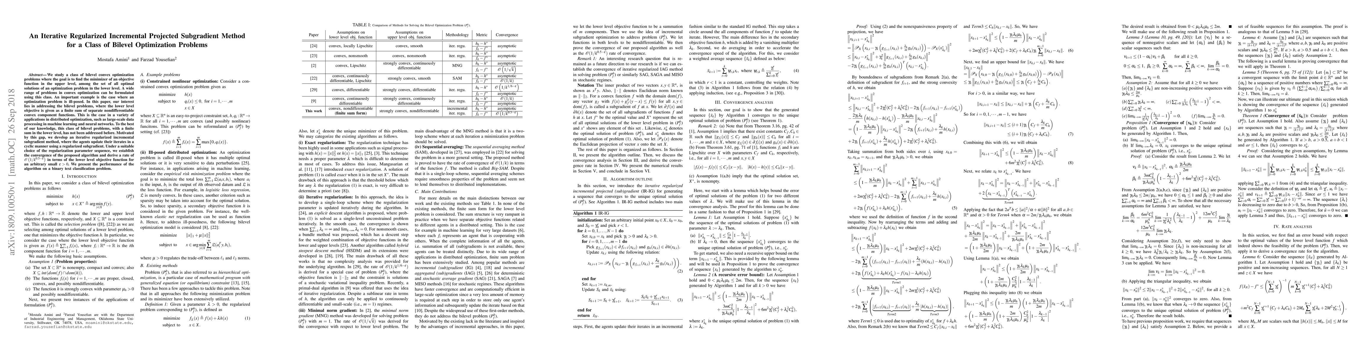 This paper introduces an iterative regularized incremental projected subgradient method for solving bilevel convex optimization problems, particularly focusing on cases where the lower level involves a finite sum of nondifferentiable convex functions. The proposed method converges and achieves a convergence rate of $\mathcal{O} \left({1}/k^{0.5-\epsilon}\right)$, demonstrating its effectiveness through a binary text classification application.