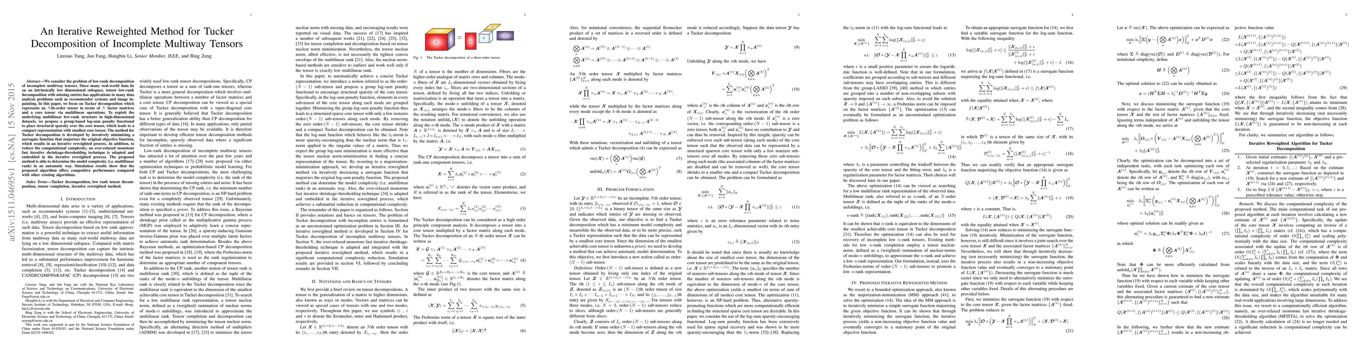 This paper proposes an iterative reweighted method for Tucker decomposition of incomplete multiway tensors, utilizing a group-based log-sum penalty to enforce structural sparsity and an over-relaxed monotone fast iterative shrinkage-thresholding technique to reduce computational complexity. The method automatically determines the multilinear rank and shows competitive performance in simulations.