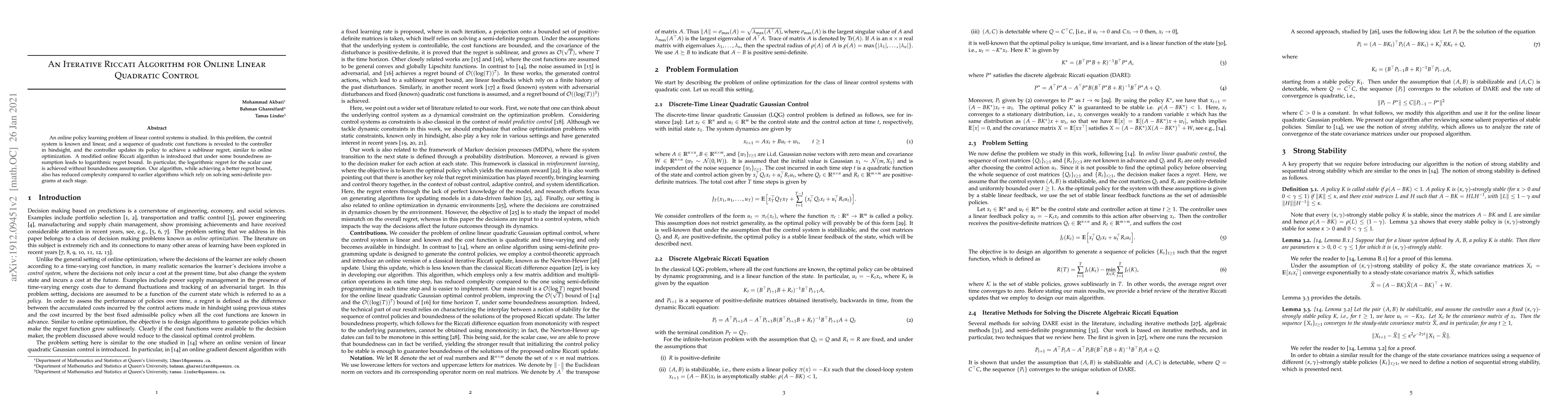 This paper introduces a modified iterative Riccati algorithm for online linear quadratic control, achieving a logarithmic regret bound under certain conditions, and demonstrating reduced complexity compared to previous methods. The algorithm effectively updates the controller's policy to minimize regret in linear control systems.