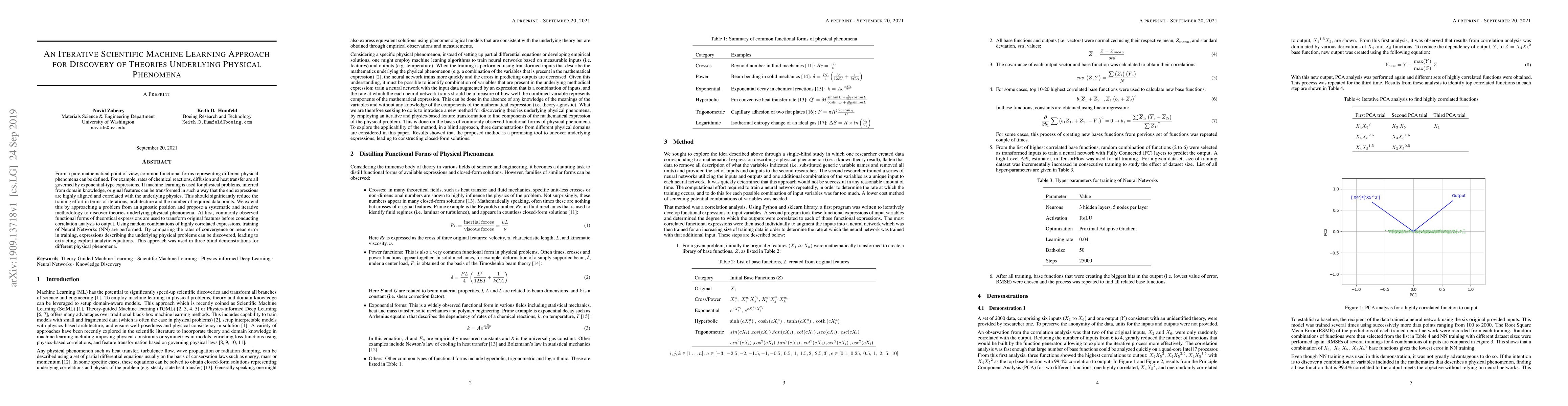 Form a pure mathematical point of view, common functional forms representing different physical phenomena can be defined. For example, rates of chemical reactions, diffusion and heat transfer are all governed by exponential-type expressions. If machine learning is used for physical problems, inferred from domain knowledge, original features can be transformed in such a way that the end expressions are highly aligned and correlated with the underlying physics. This should significantly reduce the training effort in terms of iterations, architecture and the number of required data points. We extend this by approaching a problem from an agnostic position and propose a systematic and iterative methodology to discover theories underlying physical phenomena. At first, commonly observed functional forms of theoretical expressions are used to transform original features before conducting correlation analysis to output. Using random combinations of highly correlated expressions, training of Neural Networks (NN) are performed. By comparing the rates of convergence or mean error in training, expressions describing the underlying physical problems can be discovered, leading to extracting explicit analytic equations. This approach was used in three blind demonstrations for different physical phenomena.
