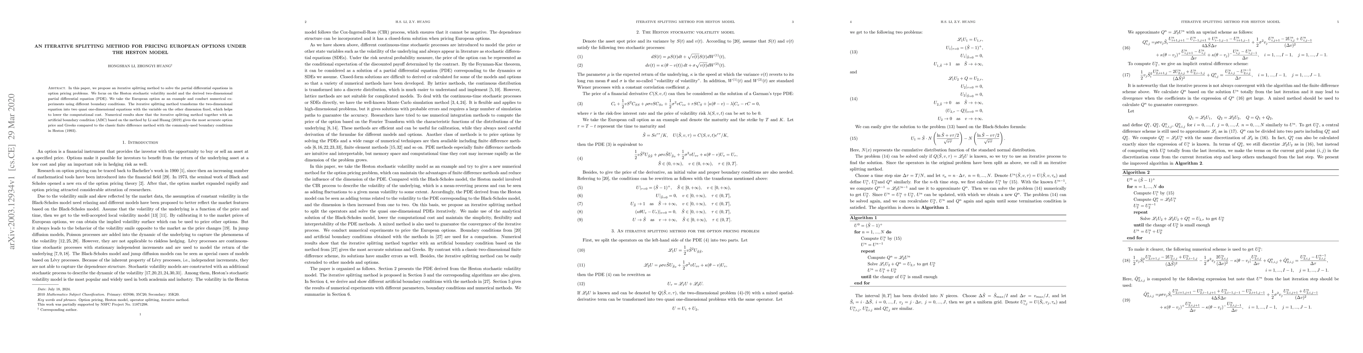 This paper introduces an iterative splitting method to efficiently solve the partial differential equation (PDE) for pricing European options under the Heston stochastic volatility model. The method transforms the two-dimensional PDE into two quasi one-dimensional equations, significantly reducing computational costs while maintaining high accuracy compared to traditional finite difference methods.