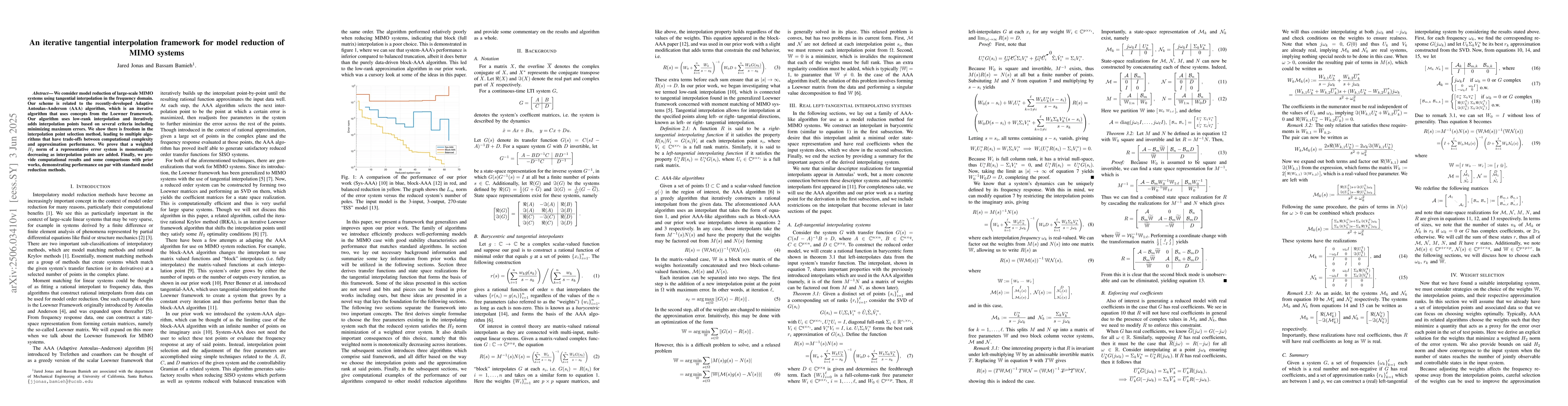 The research proposes an iterative tangential interpolation framework for model reduction of MIMO systems in the frequency domain, building upon the Adaptive Antoulas--Anderson (AAA) algorithm and utilizing low-rank interpolation with strategic addition of interpolation points.