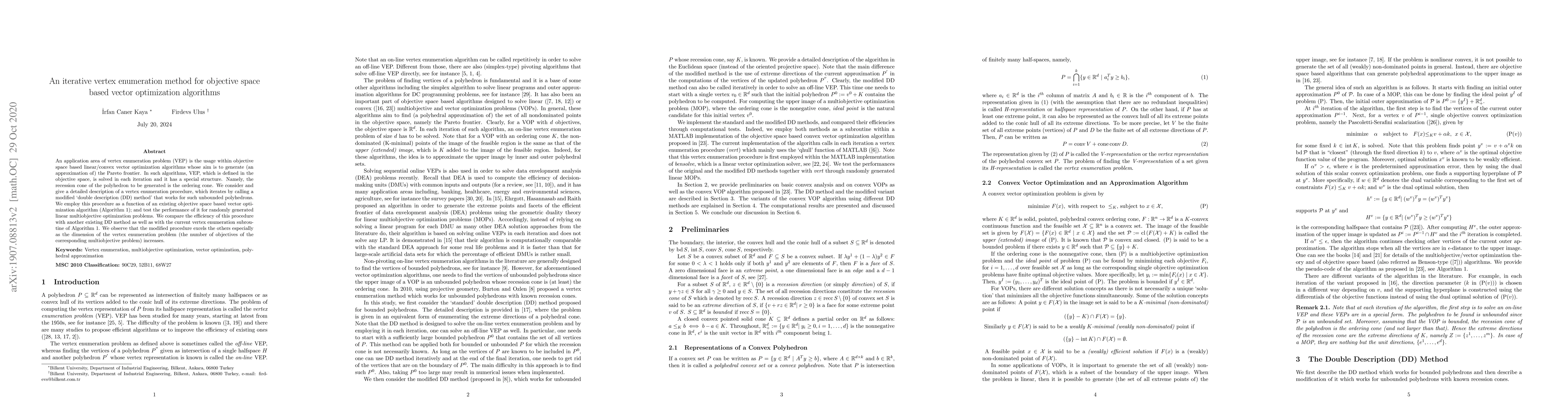 An application area of vertex enumeration problem (VEP) is the usage within objective space based linear/convex {vector} optimization algorithms whose aim is to generate (an approximation of) the Pareto frontier. In such algorithms, VEP, which is defined in the objective space, is solved in each iteration and it has a special structure. Namely, the recession cone of the polyhedron to be generated is the {ordering} cone. We {consider and give a detailed description of} a vertex enumeration procedure, which iterates by calling a modified `double description (DD) method' that works for such unbounded polyhedrons. We employ this procedure as a function of an existing objective space based {vector} optimization algorithm (Algorithm 1); and test the performance of it for randomly generated linear multiobjective optimization problems. We compare the efficiency of this procedure with another existing DD method as well as with the current vertex enumeration subroutine of Algorithm 1. We observe that the modified procedure excels the others especially as the dimension of the vertex enumeration problem (the number of objectives of the corresponding multiobjective problem) increases.
