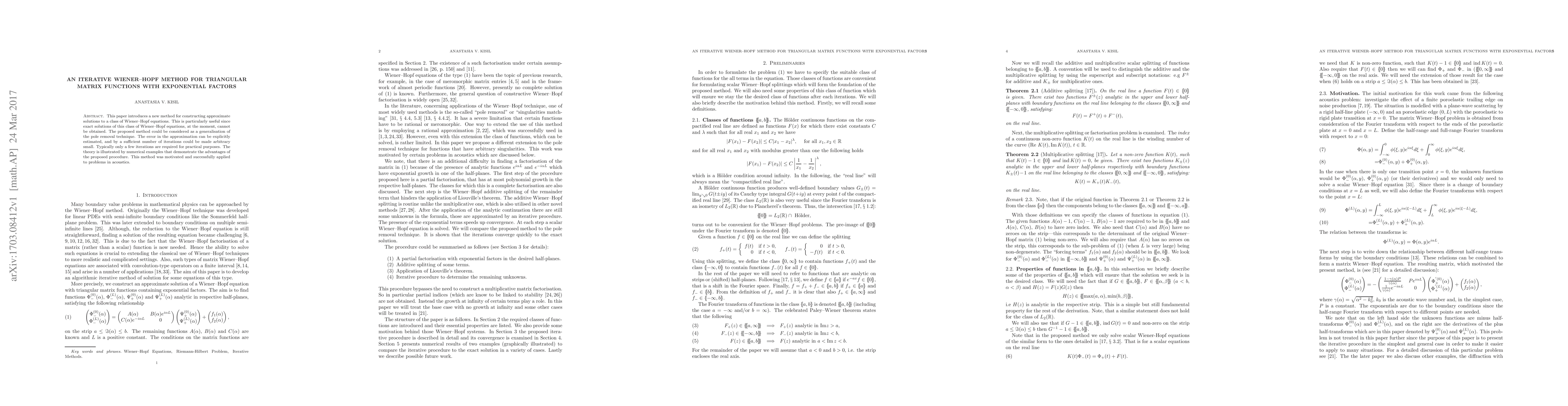This paper introduces a new method for constructing approximate solutions to a class of Wiener--Hopf equations. This is particularly useful since exact solutions of this class of Wiener--Hopf equations, at the moment, cannot be obtained. The proposed method could be considered as a generalisation of the pole removal technique. The error in the approximation can be explicitly estimated, and by a sufficient number of iterations could be made arbitrary small. Typically only a few iterations are required for practical purposes. The theory is illustrated by numerical examples that demonstrate the advantages of the proposed procedure. This method was motivated and successfully applied to problems in acoustics.