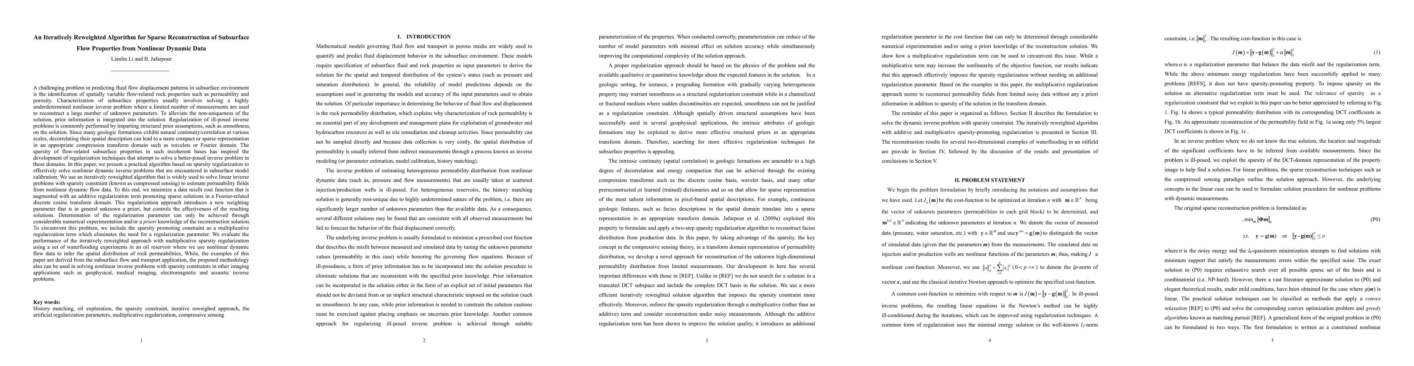 In this paper, we present a practical algorithm based on sparsity regularization to effectively solve nonlinear dynamic inverse problems that are encountered in subsurface model calibration. We use an iteratively reweighted algorithm that is widely used to solve linear inverse problems with sparsity constraint known as compressed sensing to estimate permeability fields from nonlinear dynamic flow data.