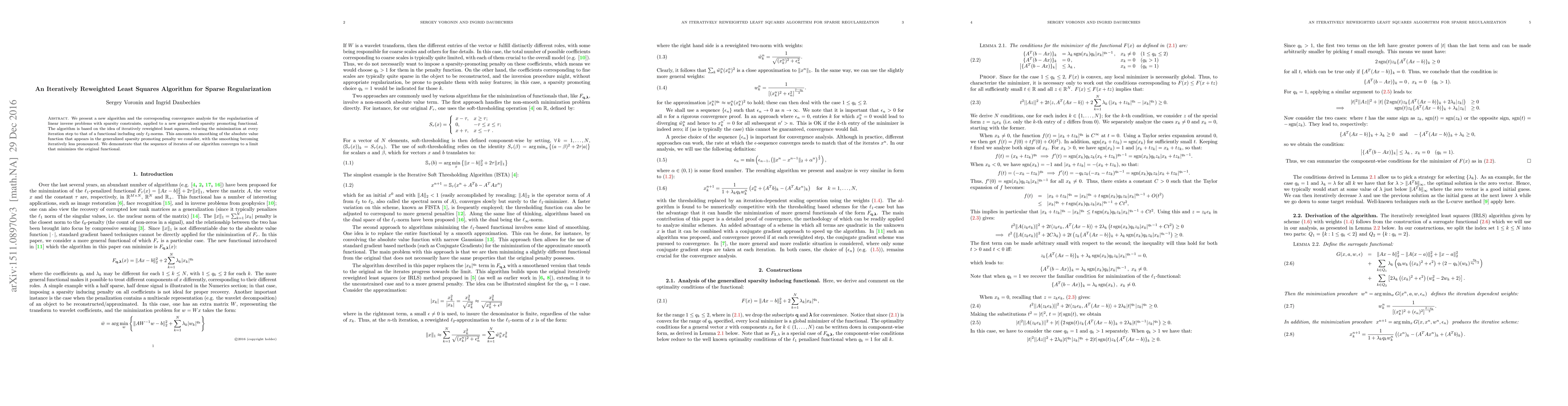 The paper presents an iteratively reweighted least squares algorithm for sparse regularization, based on smoothing the absolute value function iteratively less pronounced, and demonstrates convergence to the limit minimizing the original functional.