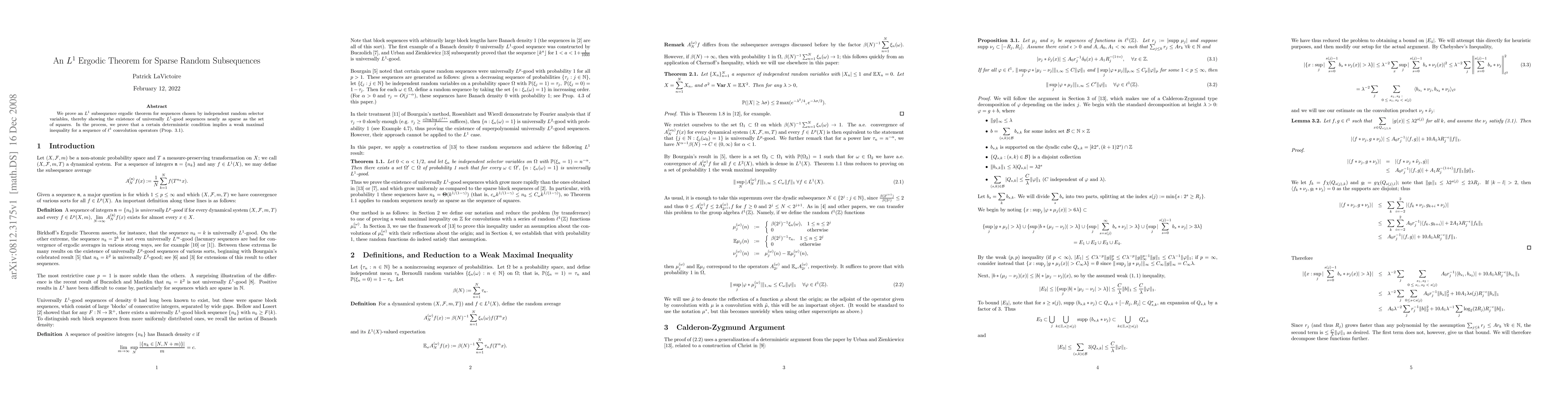 This research proves an L^1 subsequence ergodic theorem for sparse random subsequences, showing nearly as sparse sequences exist that are good for L^1 convergence. It also establishes a weak maximal inequality for π^1 convolution operators under certain deterministic conditions.