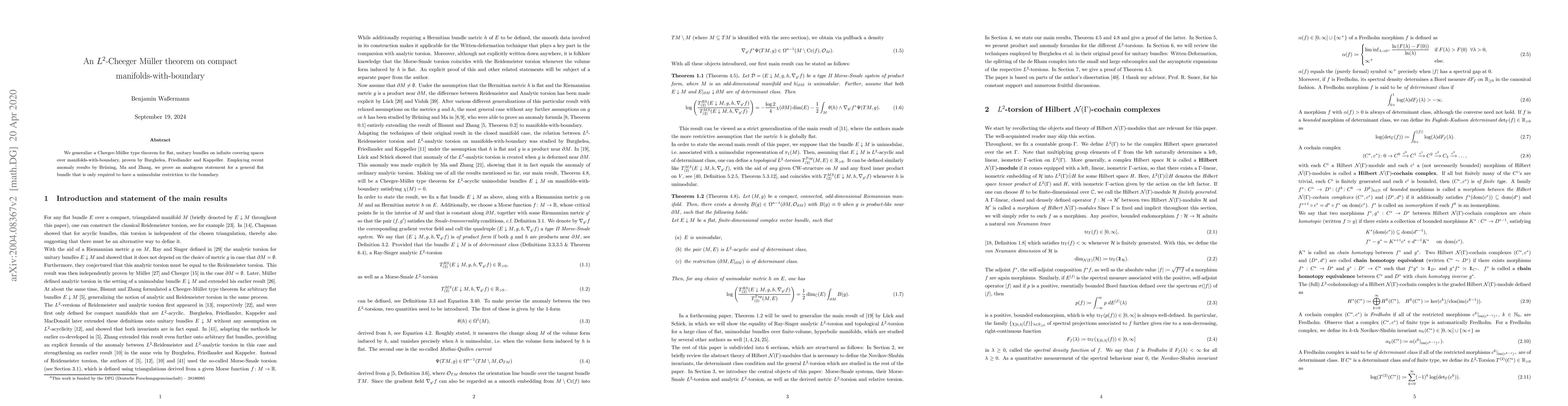 Title: An $L^2$-Cheeger M\"uller theorem on compact manifolds-with-boundary Summary: This paper generalizes a Cheeger-M\"uller theorem for flat, unitary bundles over infinite covering spaces, adapting the result to compact manifolds with boundary using recent anomaly results and requiring only a unimodular restriction on the boundary.