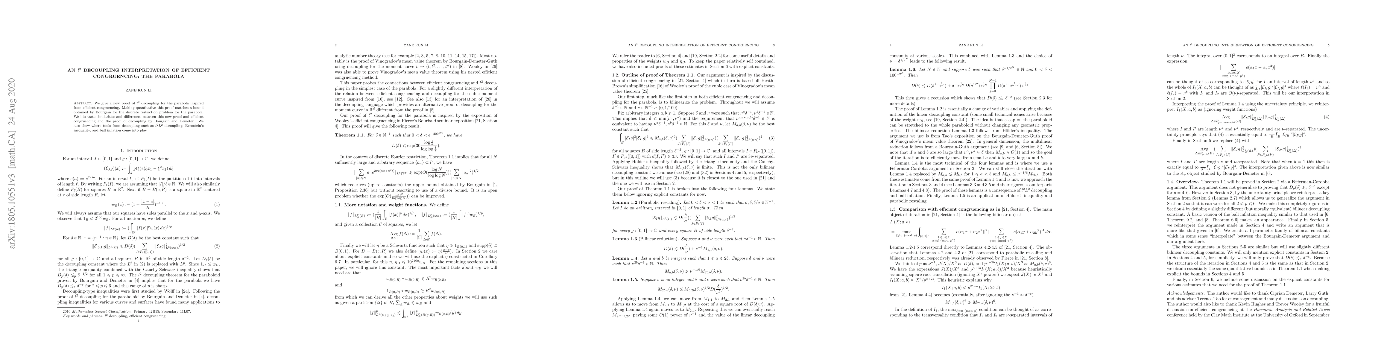 This paper presents a novel $l^2$ decoupling proof for the parabola, inspired by efficient congruencing, matching Bourgain's bound for the discrete restriction problem. It compares this new approach with efficient congruencing and Bourgain-Demeter's decoupling proof, highlighting the role of $l^2 L^2$ decoupling, Bernstein, and ball inflation techniques.