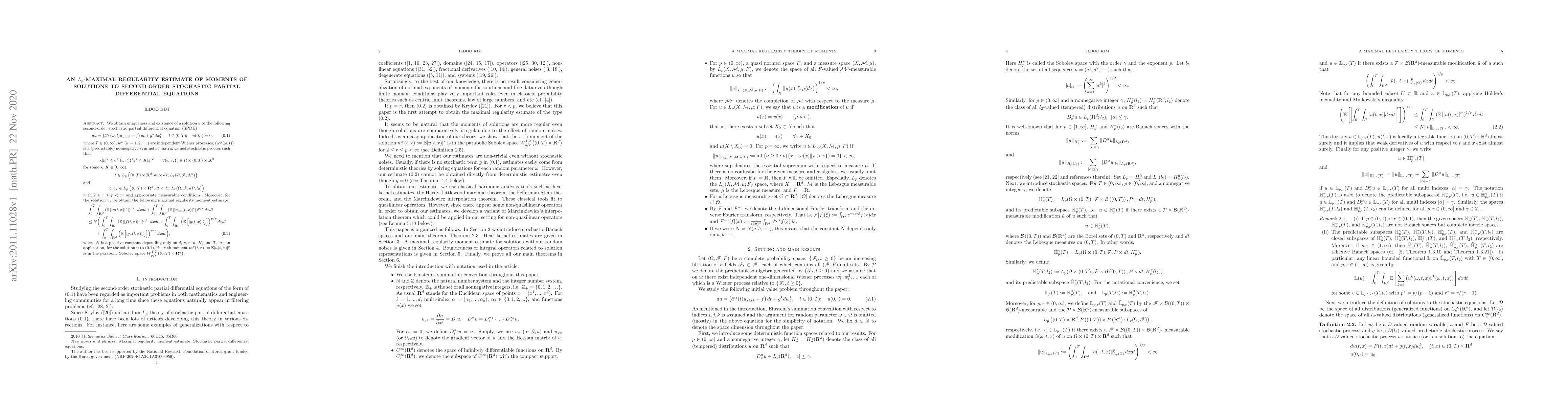 We obtain uniqueness and existence of a solution $u$ to the following second-order stochastic partial differential equation (SPDE) : \begin{align} \label{abs eqn} du= \left( \bar a^{ij}(\omega,t)u_{x^ix^j}+ f \right)dt + g^k dw^k_t, \quad t \in (0,T); \quad u(0,\cdot)=0, \end{align} where $T \in (0,\infty)$, $w^k$ $(k=1,2,\ldots)$ are independent Wiener processes, $(\bar a^{ij}(\omega,t))$ is a (predictable) nonnegative symmetric matrix valued stochastic process such that $$ \kappa |\xi|^2 \leq \bar a^{ij}(\omega,t) \xi^i \xi^j \leq K |\xi|^2 \qquad \forall (\omega,t,\xi) \in \Omega \times (0,T) \times {\mathbf{R}}^d $$ for some $\kappa, K \in (0,\infty)$, $$ f \in L_p\left( (0,T) \times {\mathbf{R}}^d, dt \times dx ; L_r(\Omega, {\mathscr{F}} ,dP) \right), $$ and $$ g, g_x \in L_p\left( (0,T) \times {\mathbf{R}}^d, dt \times dx ; L_r(\Omega, {\mathscr{F}} ,dP; l_2) \right) $$ with $2 \leq r \leq p < \infty$ and appropriate measurable conditions.