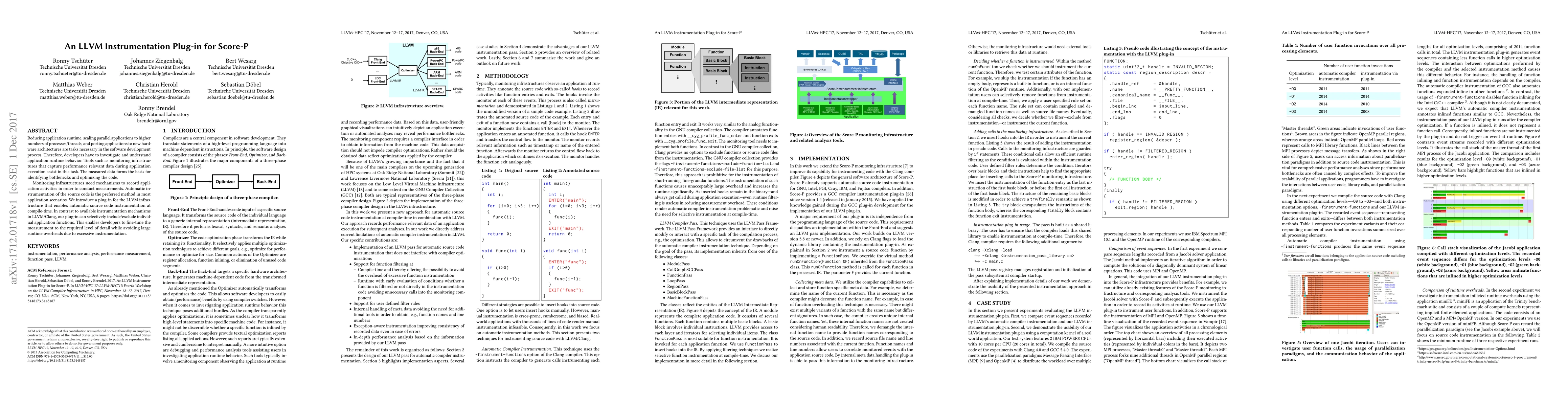 This paper introduces a LLVM instrumentation plug-in for Score-P that facilitates automatic source code instrumentation at compile-time, allowing selective inclusion/exclusion of application functions to optimize runtime performance and reduce overhead.
