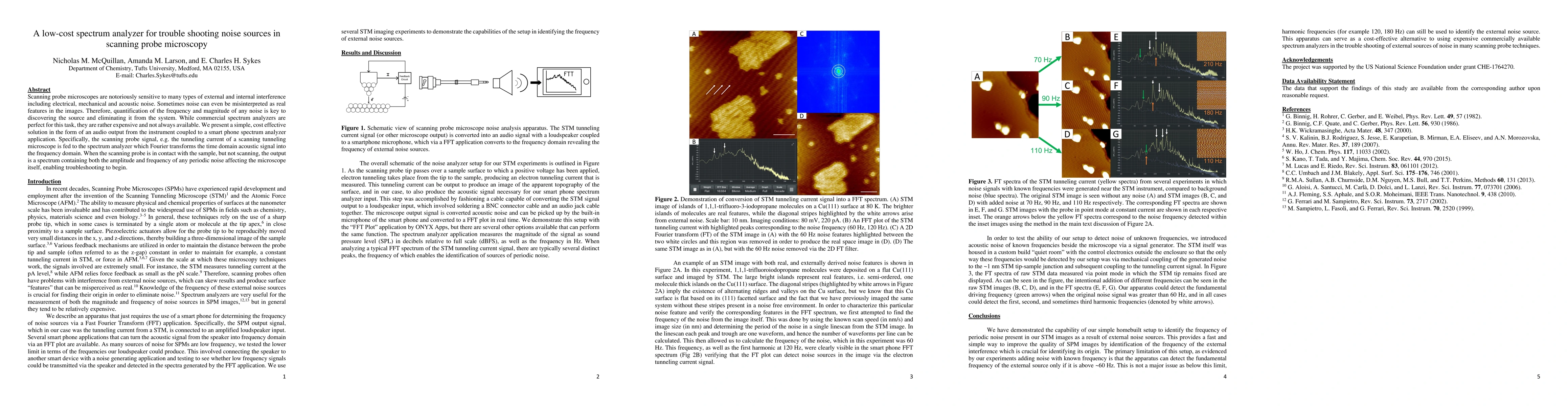 Scanning probe microscopes are notoriously sensitive to many types of external and internal interference including electrical, mechanical and acoustic noise. Sometimes noise can even be misinterpreted as real features in the images. Therefore, quantification of the frequency and magnitude of any noise is key to discovering the source and eliminating it from the system. While commercial spectrum analyzers are perfect for this task, they are rather expensive and not always available. We present a simple, cost effective solution in the form of an audio output from the instrument coupled to a smart phone spectrum analyzer application. Specifically, the scanning probe signal, e.g. the tunneling current of a scanning tunneling microscope is fed to the spectrum analyzer which Fourier transforms the time domain acoustic signal into the frequency domain. When the scanning probe is in contact with the sample, but not scanning, the output is a spectrum containing both the amplitude and frequency of any periodic noise affecting the microscope itself, enabling troubleshooting to begin.