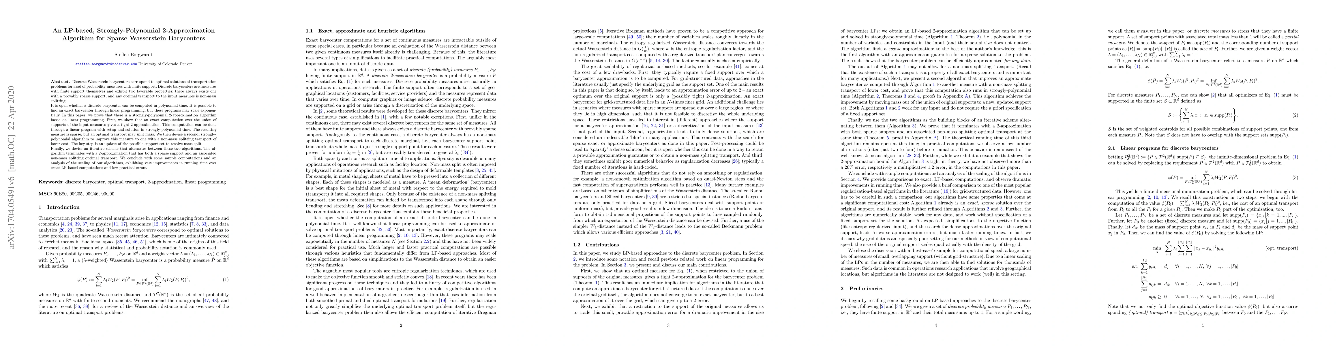 Discrete Wasserstein barycenters correspond to optimal solutions of transportation problems for a set of probability measures with finite support. Discrete barycenters are measures with finite support themselves and exhibit two favorable properties: there always exists one with a provably sparse support, and any optimal transport to the input measures is non-mass splitting. It is open whether a discrete barycenter can be computed in polynomial time. It is possible to find an exact barycenter through linear programming, but these programs may scale exponentially. In this paper, we prove that there is a strongly-polynomial 2-approximation algorithm based on linear programming. First, we show that an exact computation over the union of supports of the input measures gives a tight 2-approximation. This computation can be done through a linear program with setup and solution in strongly-polynomial time. The resulting measure is sparse, but an optimal transport may split mass. We then devise a second, strongly-polynomial algorithm to improve this measure to one with a non-mass splitting transport of lower cost. The key step is an update of the possible support set to resolve mass split. Finally, we devise an iterative scheme that alternates between these two algorithms. The algorithm terminates with a 2-approximation that has both a sparse support and an associated non-mass splitting optimal transport. We conclude with some sample computations and an analysis of the scaling of our algorithms, exhibiting vast improvements in running time over exact LP-based computations and low practical errors.