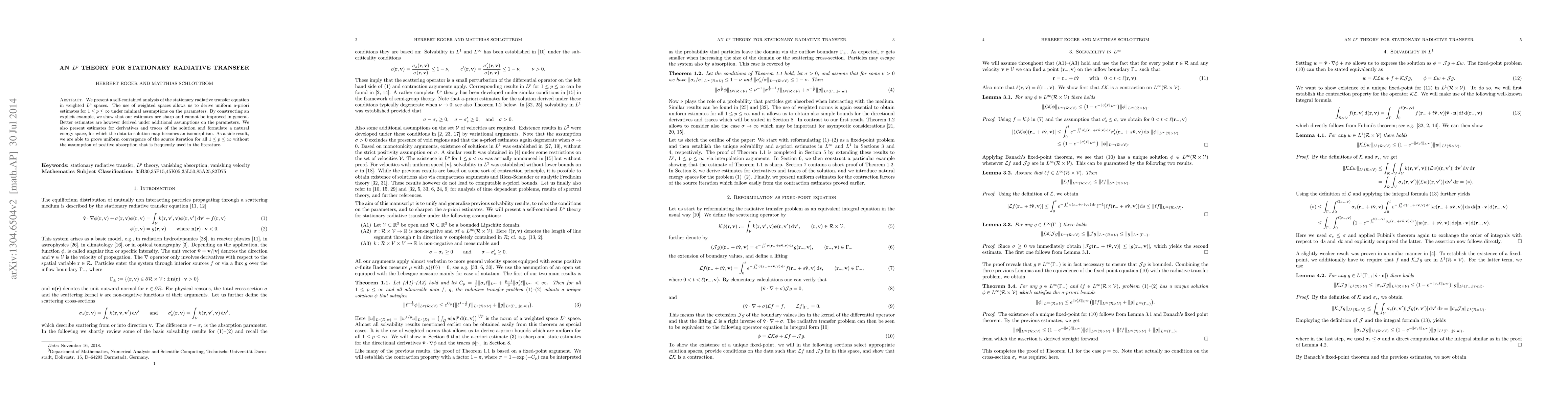 We present a self-contained analysis of the stationary radiative transfer equation in weighted $L^p$ spaces. The use of weighted spaces allows us to derive uniform a-priori estimates for $1 \le p \le \infty$ under minimal assumptions on the parameters. By constructing an explicit example, we show that our estimates are sharp and cannot be improved in general. Better estimates are however derived under additional assumptions on the parameters. We also present estimates for derivatives and traces of the solution and formulate a natural energy space, for which the data-to-solution map becomes an isomorphism. As a side result, we are able to prove uniform convergence of the source iteration for all $1 \le p \le \infty$ without the assumption of positive absorption that is frequently used in the literature.