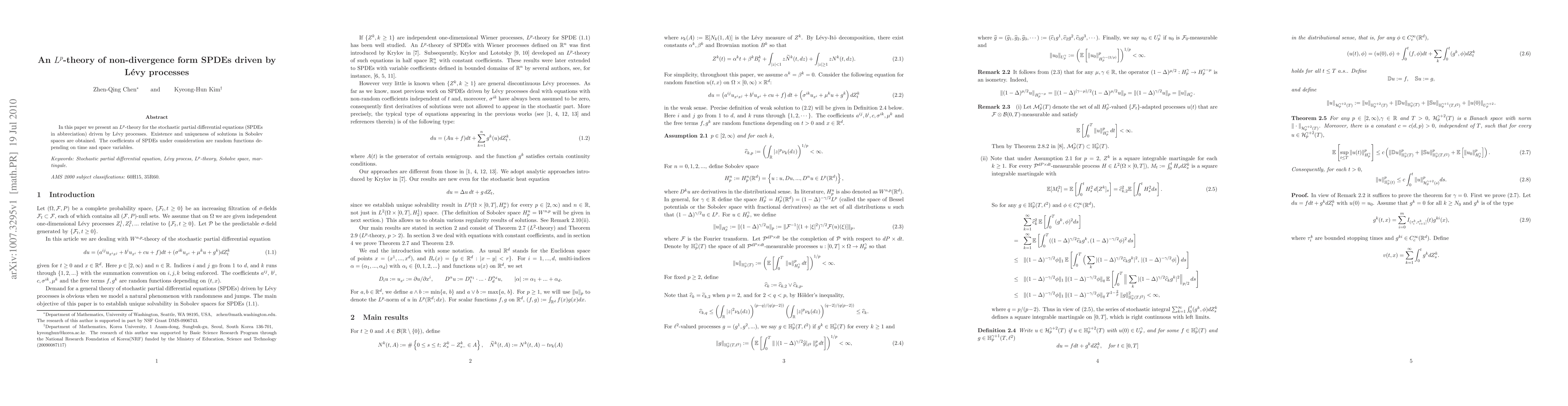 In this paper we present an $L^p$-theory for the stochastic partial differential equations (SPDEs in abbreciation) driven by L\'e{}vy processes. Existence and uniqueness of solutions in Sobolev spaces are obtained. The coefficients of SPDEs under consideration are random functions depending on time and space variables.