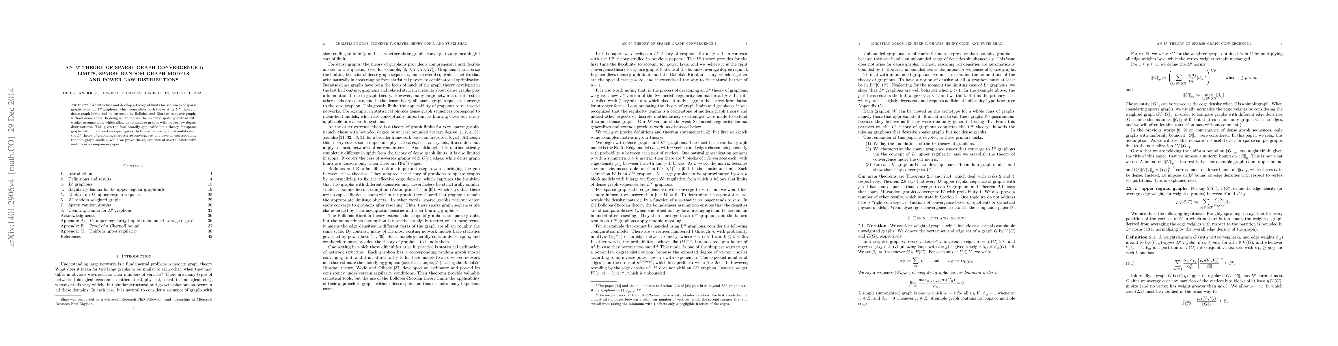 We introduce and develop a theory of limits for sequences of sparse graphs based on $L^p$ graphons, which generalizes both the existing $L^\infty$ theory of dense graph limits and its extension by Bollob\'as and Riordan to sparse graphs without dense spots. In doing so, we replace the no dense spots hypothesis with weaker assumptions, which allow us to analyze graphs with power law degree distributions. This gives the first broadly applicable limit theory for sparse graphs with unbounded average degrees. In this paper, we lay the foundations of the $L^p$ theory of graphons, characterize convergence, and develop corresponding random graph models, while we prove the equivalence of several alternative metrics in a companion paper.