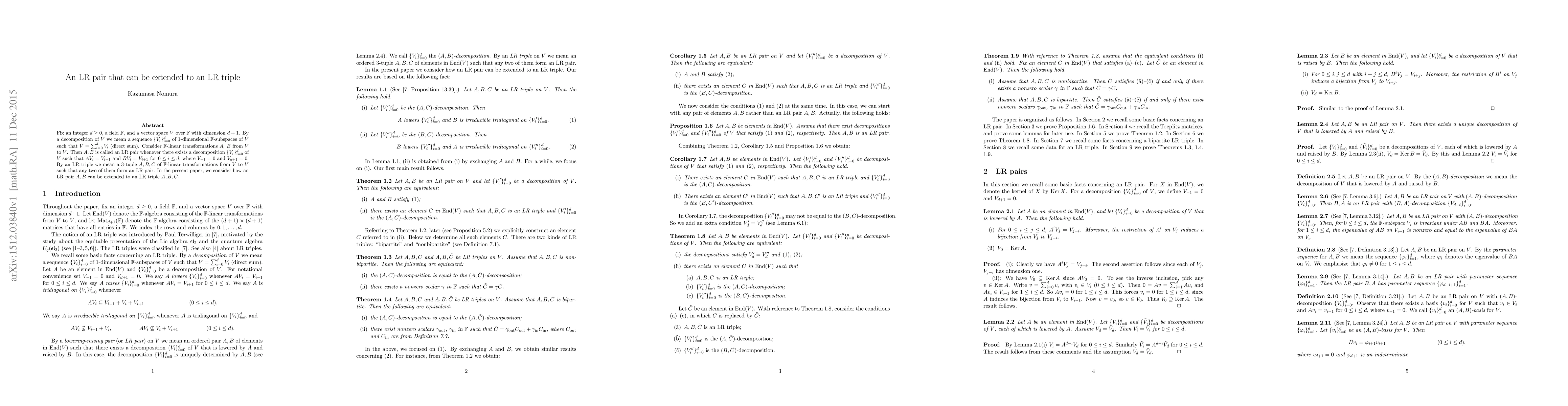 Fix an integer $d \geq 0$, a field $\mathbb{F}$, and a vector space $V$ over $\mathbb{F}$ with dimension $d+1$. By a decomposition of $V$ we mean a sequence $\{V_i\}_{i=0}^d$ of $1$-dimensional $\mathbb{F}$-subspaces of $V$ such that $V = \sum_{i=0}^d V_i$ (direct sum). Consider $\mathbb{F}$-linear transformations $A$, $B$ from $V$ to $V$. Then $A,B$ is called an LR pair whenever there exists a decomposition $\{V_i\}_{i=0}^d$ of $V$ such that $A V_i = V_{i-1}$ and $B V_i = V_{i+1}$ for $0 \leq i \leq d$, where $V_{-1}=0$ and $V_{d+1}=0$. By an LR triple we mean a $3$-tuple $A,B,C$ of $\mathbb{F}$-linear transformations from $V$ to $V$ such that any two of them form an LR pair. In the present paper, we consider how an LR pair $A,B$ can be extended to an LR triple $A,B,C$.