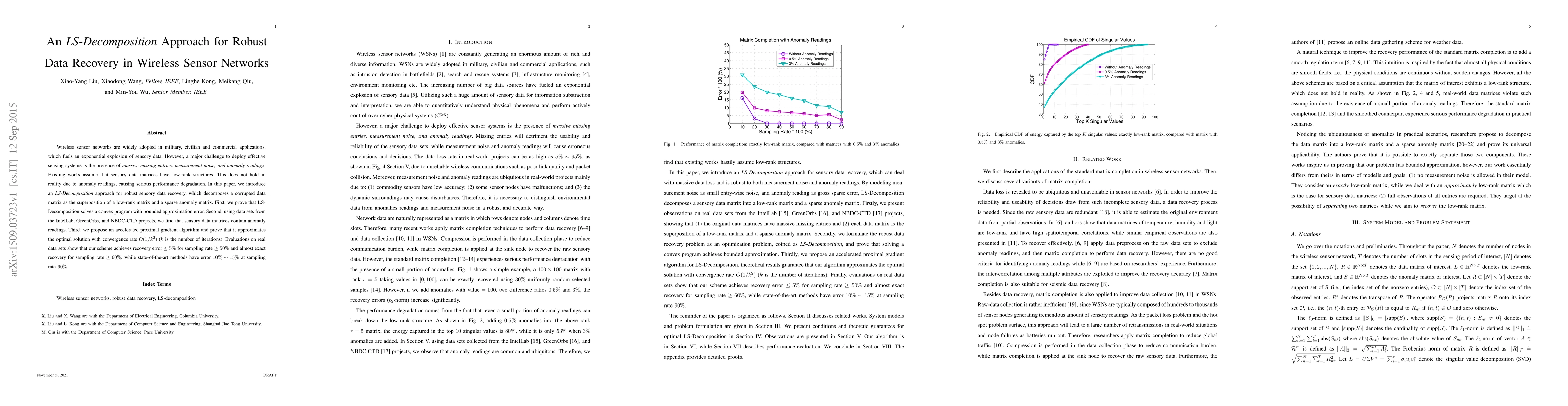 Wireless sensor networks are widely adopted in military, civilian and commercial applications, which fuels an exponential explosion of sensory data. However, a major challenge to deploy effective sensing systems is the presence of {\em massive missing entries, measurement noise, and anomaly readings}. Existing works assume that sensory data matrices have low-rank structures. This does not hold in reality due to anomaly readings, causing serious performance degradation. In this paper, we introduce an {\em LS-Decomposition} approach for robust sensory data recovery, which decomposes a corrupted data matrix as the superposition of a low-rank matrix and a sparse anomaly matrix. First, we prove that LS-Decomposition solves a convex program with bounded approximation error. Second, using data sets from the IntelLab, GreenOrbs, and NBDC-CTD projects, we find that sensory data matrices contain anomaly readings. Third, we propose an accelerated proximal gradient algorithm and prove that it approximates the optimal solution with convergence rate $O(1/k^2)$ ($k$ is the number of iterations). Evaluations on real data sets show that our scheme achieves recovery error $\leq 5\%$ for sampling rate $\geq 50\%$ and almost exact recovery for sampling rate $\geq 60\%$, while state-of-the-art methods have error $10\% \sim 15\%$ at sampling rate $90\%$.