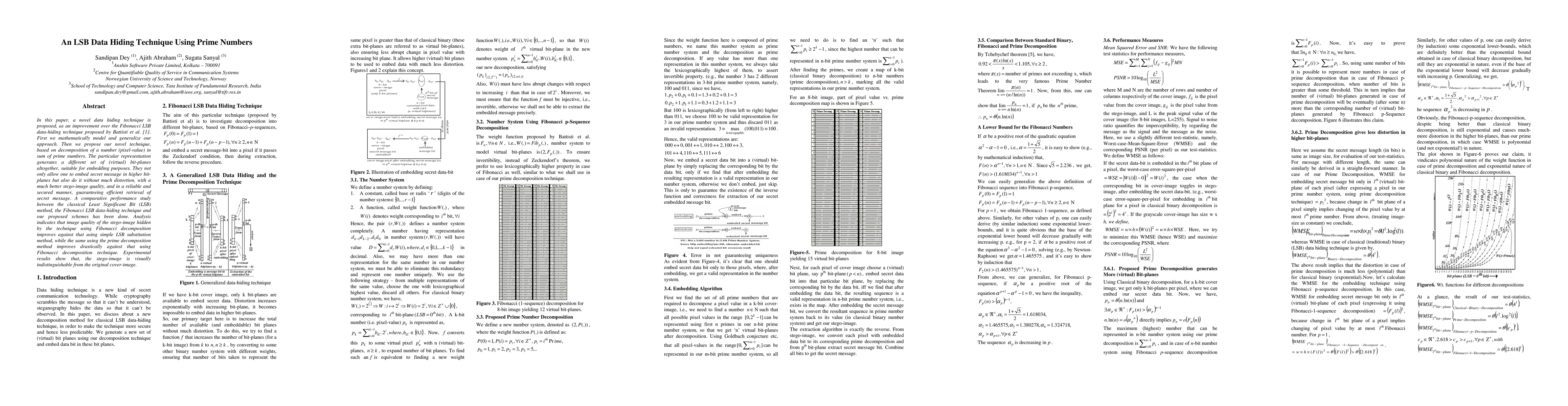 In this paper, a novel data hiding technique is proposed, as an improvement over the Fibonacci LSB data-hiding technique proposed by Battisti et al. First we mathematically model and generalize our approach. Then we propose our novel technique, based on decomposition of a number (pixel-value) in sum of prime numbers. The particular representation generates a different set of (virtual) bit-planes altogether, suitable for embedding purposes. They not only allow one to embed secret message in higher bit-planes but also do it without much distortion, with a much better stego-image quality, and in a reliable and secured manner, guaranteeing efficient retrieval of secret message. A comparative performance study between the classical Least Significant Bit (LSB)method, the Fibonacci LSB data-hiding technique and our proposed schemes has been done. Analysis indicates that image quality of the stego-image hidden by the technique using Fibonacci decomposition improves against that using simple LSB substitution method, while the same using the prime decomposition method improves drastically against that using Fibonacci decomposition technique. Experimental results show that, the stego-image is visually indistinguishable from the original cover-image.