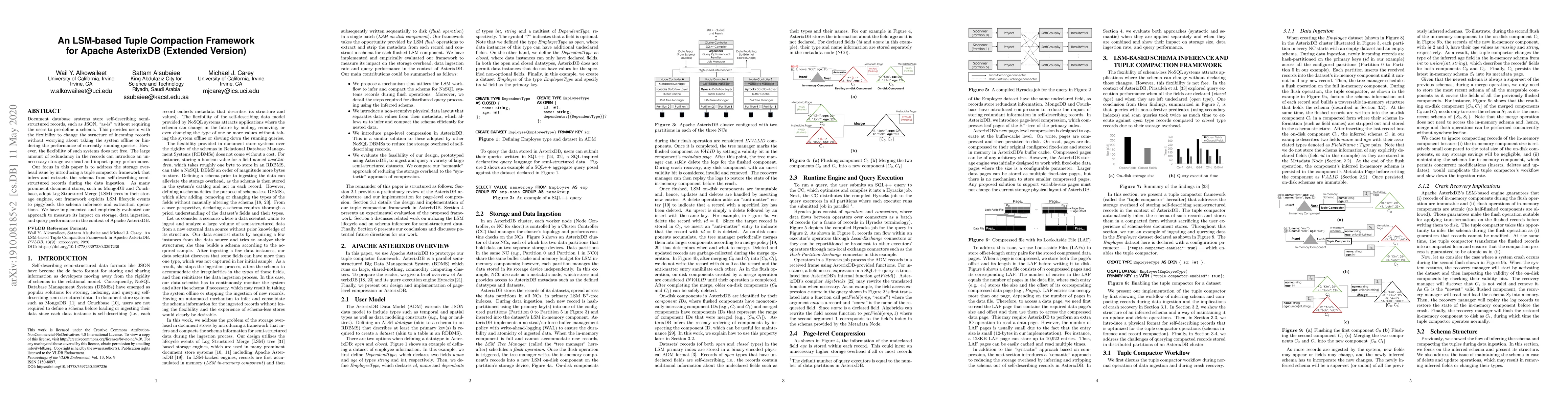 This paper introduces a tuple compaction framework leveraging LSM trees to reduce storage overhead in document database systems by inferring and extracting schemas from semi-structured records during data ingestion, thereby improving storage and query performance in Apache AsterixDB. The framework exploits LSM lifecycle events for efficient schema inference and extraction.