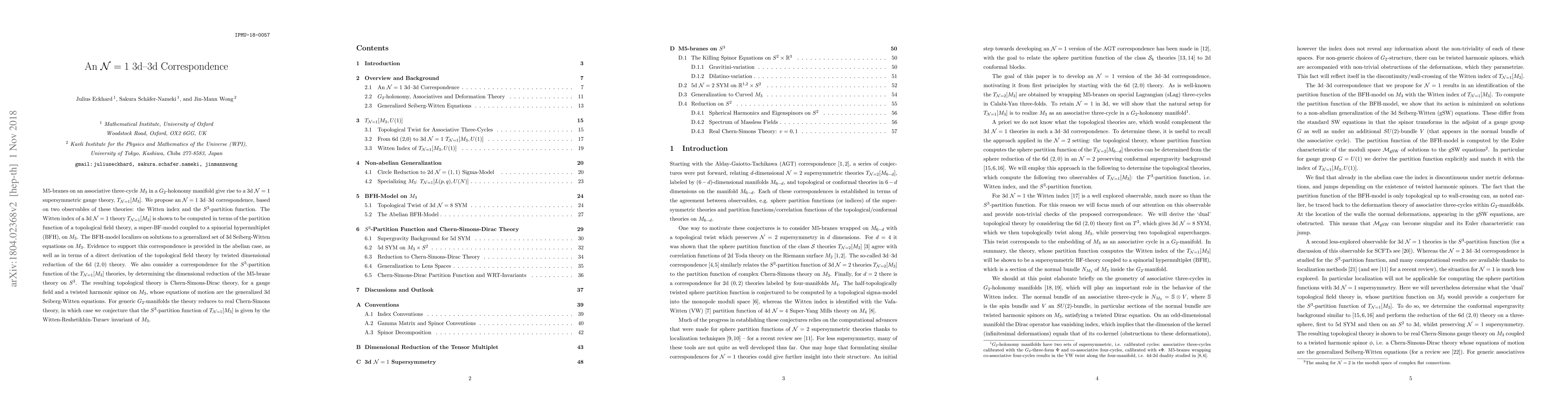 The paper introduces an $\mathcal{N}=1$ 3d-3d correspondence, linking observables of 3d $\mathcal{N}=1$ gauge theories to topological field theories, and derives the $S^3$-partition function in terms of a Chern-Simons-Dirac theory on the associative three-cycle $M_3$.