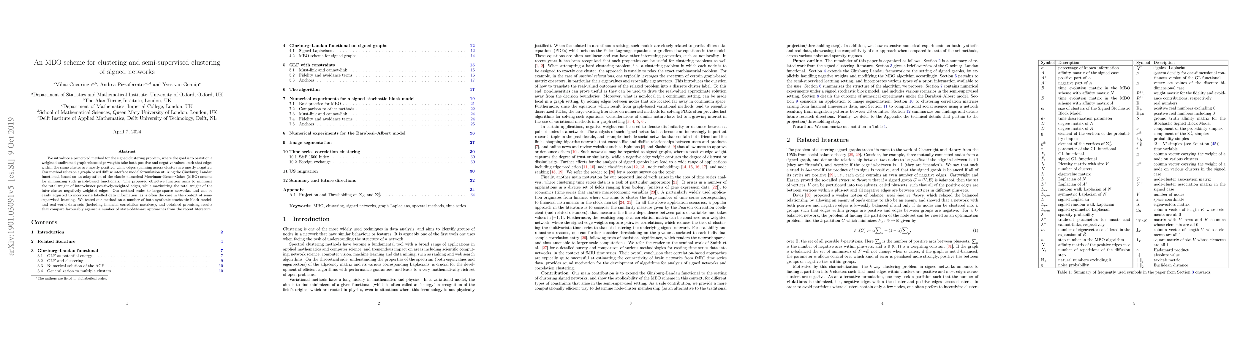 This paper proposes a novel MBO scheme for clustering signed networks, aiming to partition graphs with both positive and negative edge weights such that intra-cluster edges are mostly positive and inter-cluster edges are mostly negative. The method scales to large networks and can incorporate labeled data for semi-supervised clustering, showing promising results on both synthetic and real-world datasets.