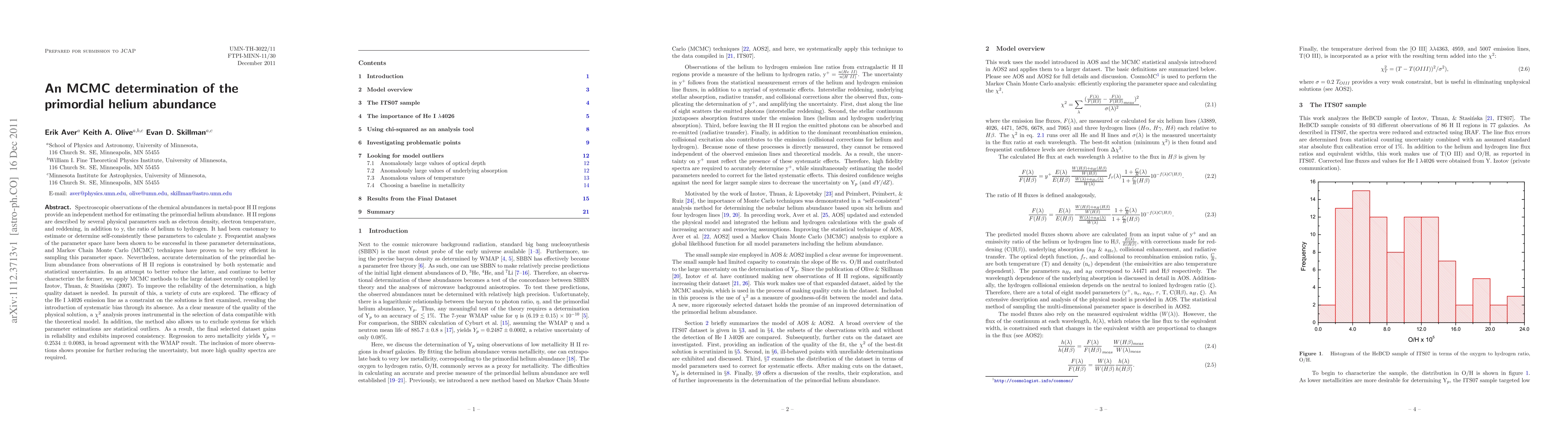 This paper uses Markov Chain Monte Carlo (MCMC) techniques to determine the primordial helium abundance from spectroscopic observations of metal-poor H II regions. The study refines the dataset to improve reliability and consistency, ultimately yielding a primordial helium abundance of Y_p = 0.2534 ± 0.0083, in agreement with WMAP results, though further high-quality data is needed to reduce uncertainties.