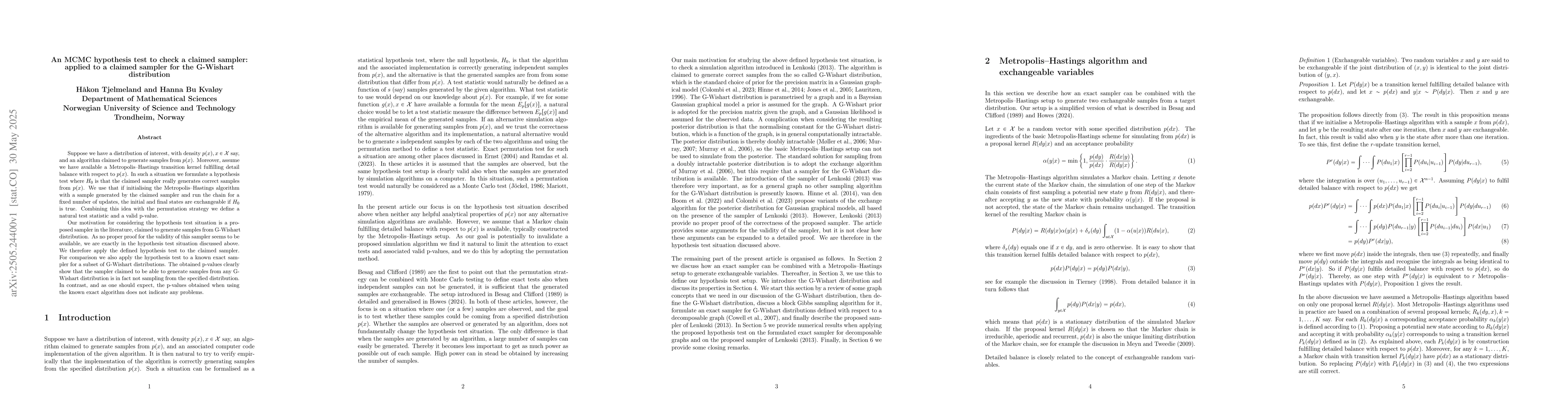 The paper introduces an MCMC hypothesis test based on exchangeability under a Metropolis--Hastings algorithm, providing a valid p-value and test statistic to assess the correctness of claimed samplers.