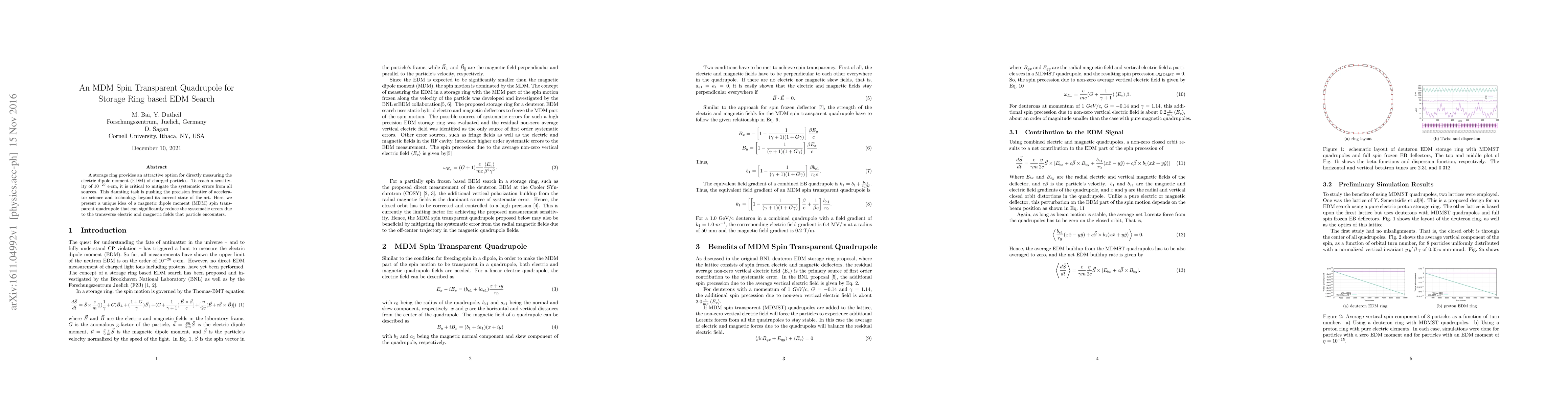 This paper proposes a novel magnetic dipole moment spin transparent quadrupole for a storage ring to enhance the precision of electric dipole moment measurements, aiming to reduce systematic errors and reach a sensitivity of 10^-29 e x cm. This innovation is crucial for advancing the frontier of accelerator science and technology.