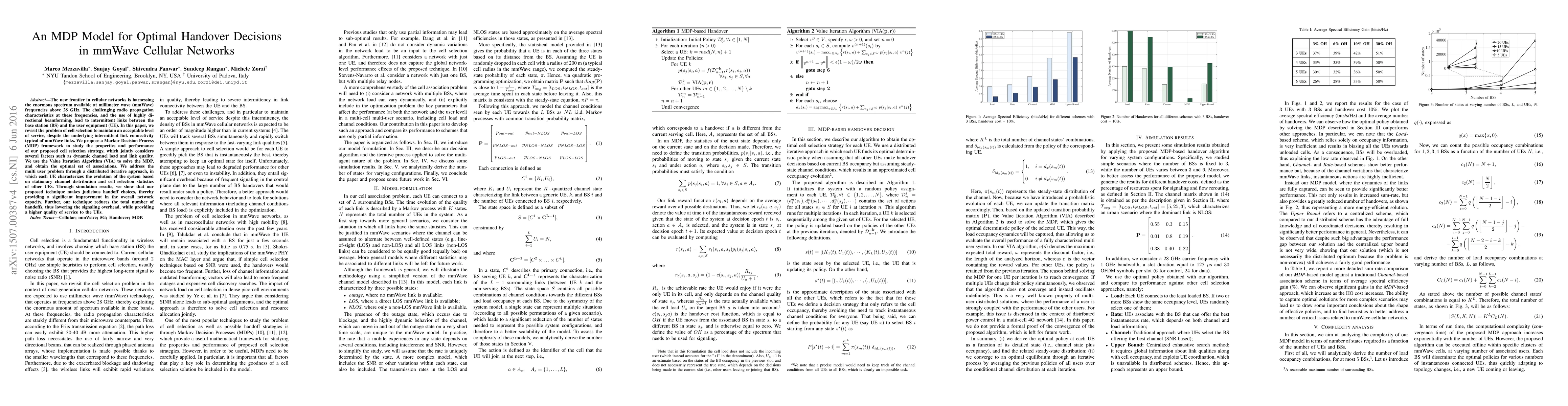 This paper proposes an MDP model for optimal handover decisions in mmWave cellular networks, achieving a significant improvement in network capacity and reducing signaling overhead.