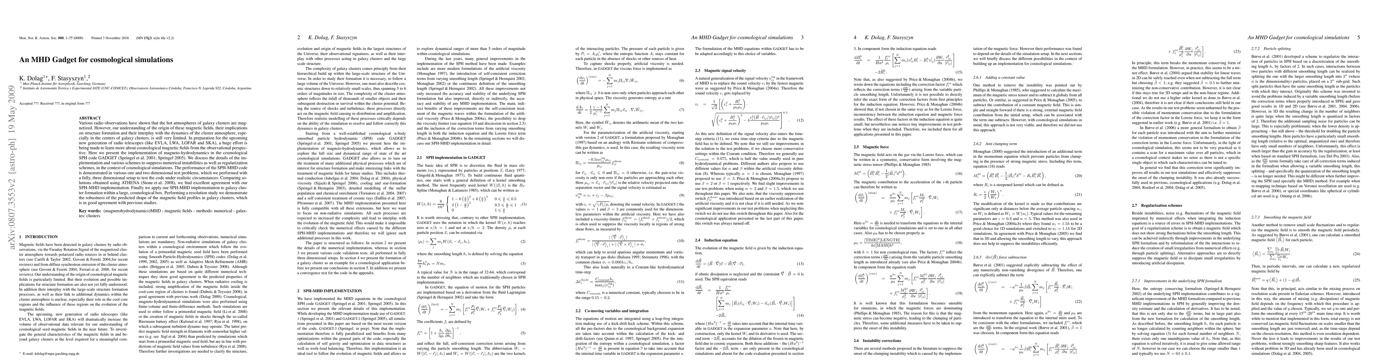 This paper presents an implementation of magnetohydrodynamics (MHD) in the cosmological Smoothed Particle Hydrodynamics (SPH) code GADGET, focusing on suppressing numerical instabilities and demonstrating the code's performance through various test problems. The study applies the MHD code to galaxy cluster formation simulations, showing robust magnetic field profiles consistent with previous research.