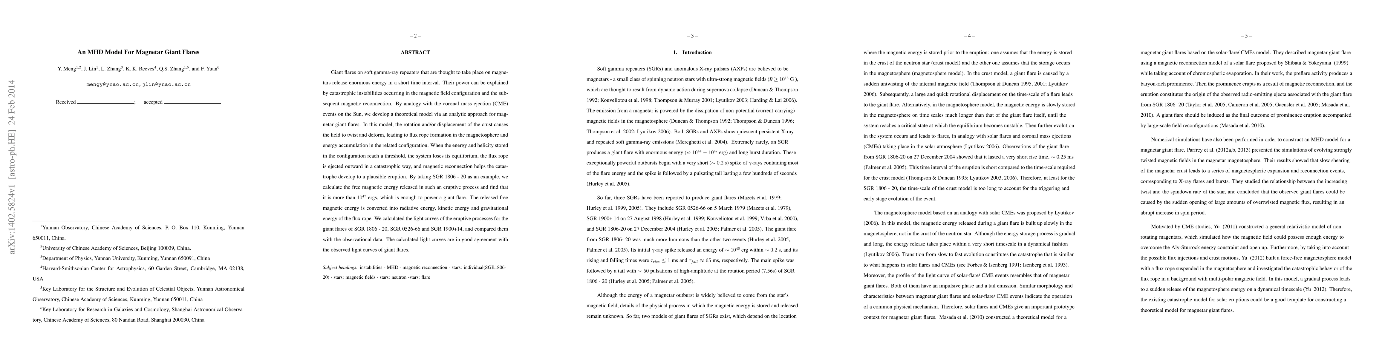 This paper develops an MHD model to explain magnetar giant flares, attributing their immense energy release to catastrophic instabilities and magnetic reconnection. The model predicts that crustal rotation or displacement leads to flux rope formation and energy accumulation, culminating in a catastrophic ejection and flare, with calculations showing the released magnetic energy can power such flares and match observed light curves.