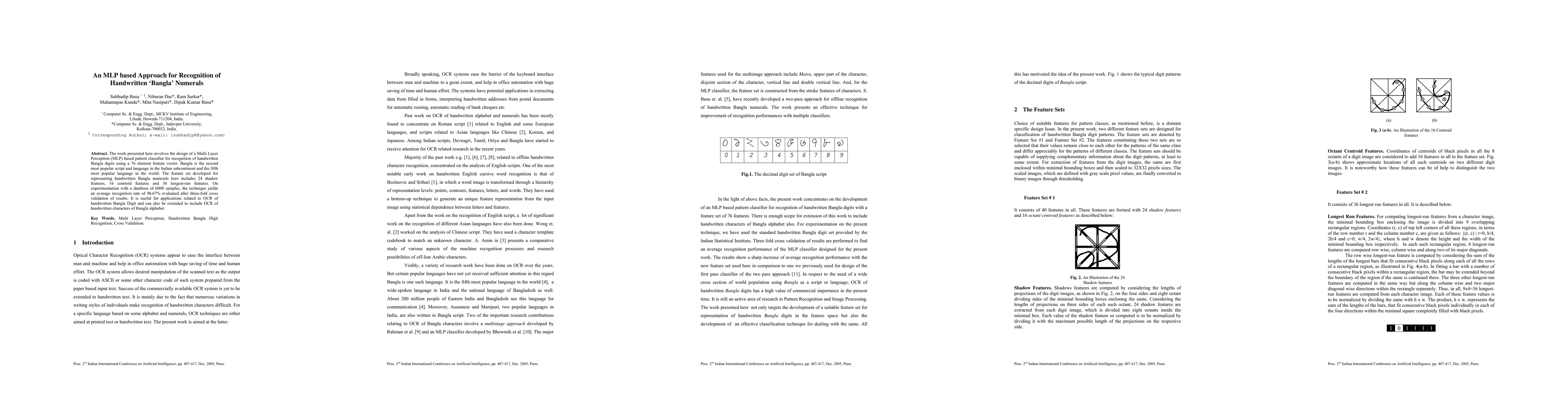This research proposes an MLP-based pattern classifier for recognizing handwritten Bangla numerals, achieving a 96.67% recognition rate with a feature set including shadow, centroid, and longest-run features, demonstrating its potential for OCR applications in Bangla scripts.