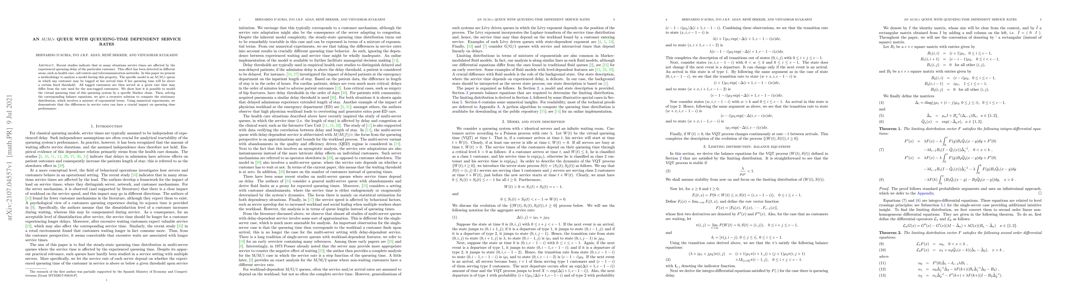 This paper analyzes an M/M/c queue where service rates depend on queueing time, tagging customers who exceed a delay threshold for different service rates. It models the system using a Markov chain and provides a recursive solution for the stationary distribution, showing significant impacts on queueing performance due to varying service rates.