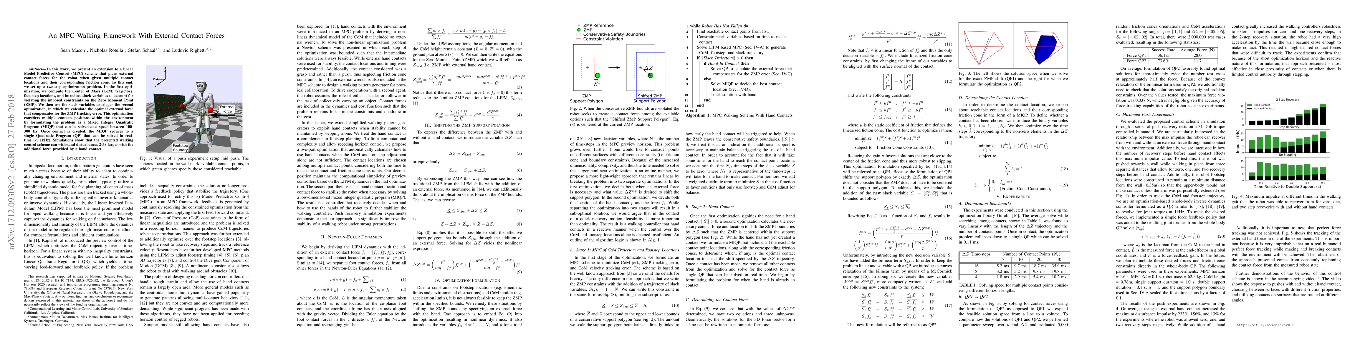 In this work, we present an extension to a linear Model Predictive Control (MPC) scheme that plans external contact forces for the robot when given multiple contact locations and their corresponding friction cone. To this end, we set up a two-step optimization problem. In the first optimization, we compute the Center of Mass (CoM) trajectory, foot step locations, and introduce slack variables to account for violating the imposed constraints on the Zero Moment Point (ZMP). We then use the slack variables to trigger the second optimization, in which we calculate the optimal external force that compensates for the ZMP tracking error. This optimization considers multiple contacts positions within the environment by formulating the problem as a Mixed Integer Quadratic Program (MIQP) that can be solved at a speed between 100-300 Hz. Once contact is created, the MIQP reduces to a single Quadratic Program (QP) that can be solved in real-time ($<$ 1kHz). Simulations show that the presented walking control scheme can withstand disturbances 2-3x larger with the additional force provided by a hand contact.