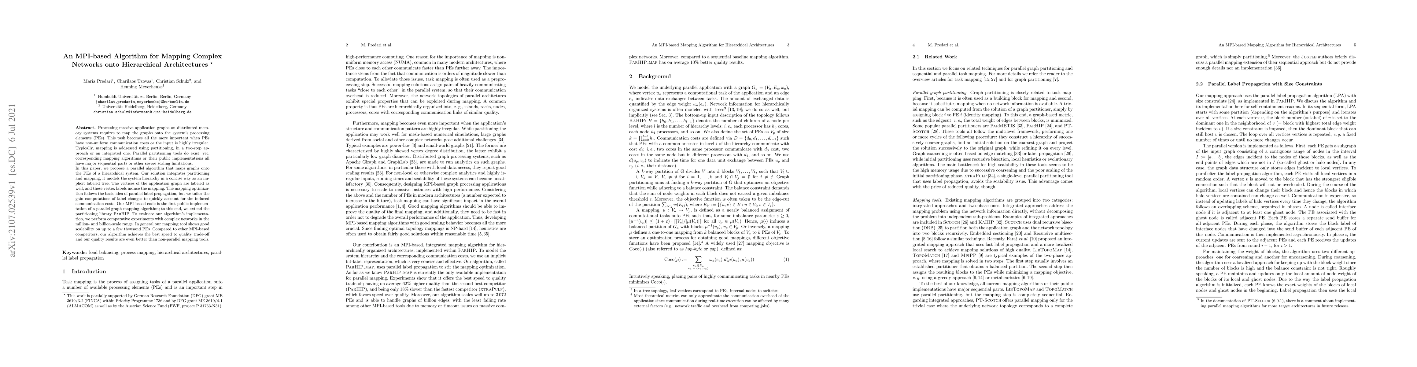 This paper proposes a parallel MPI-based algorithm for mapping complex networks onto hierarchical architectures, integrating partitioning and mapping through label propagation. The algorithm shows good scalability and outperforms other MPI-based competitors in speed and quality.