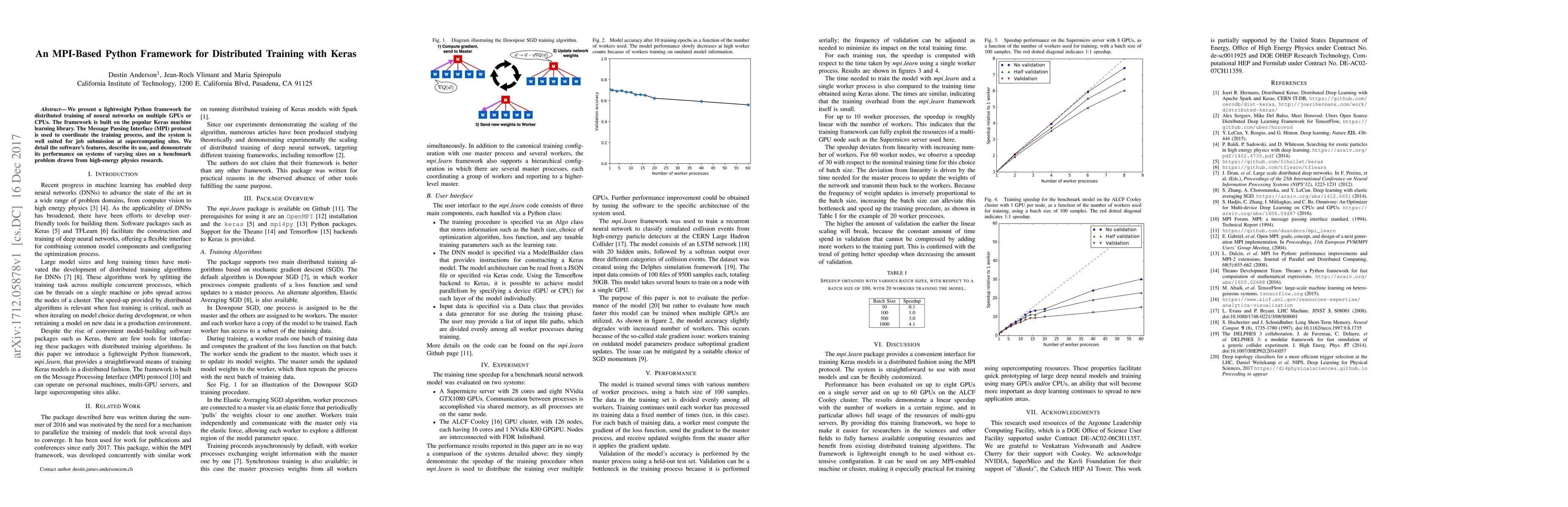 We present a lightweight Python framework for distributed training of neural networks on multiple GPUs or CPUs. The framework is built on the popular Keras machine learning library. The Message Passing Interface (MPI) protocol is used to coordinate the training process, and the system is well suited for job submission at supercomputing sites. We detail the software's features, describe its use, and demonstrate its performance on systems of varying sizes on a benchmark problem drawn from high-energy physics research.