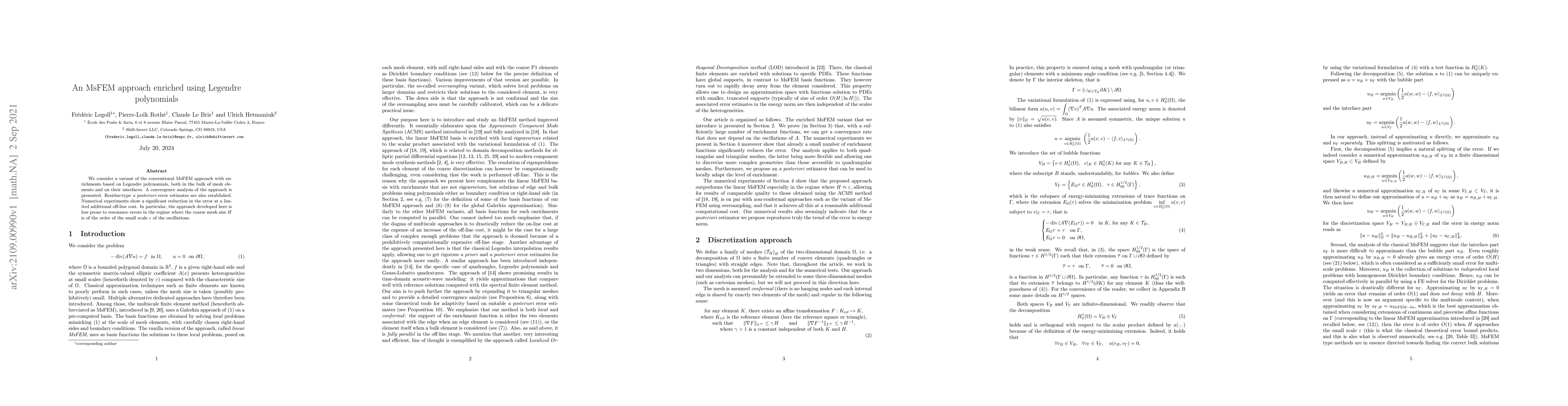 A new approach to MsFEM (Multi-Scale Finite Element Method) using Legendre polynomials is presented, showing a significant reduction in error with minimal additional cost.