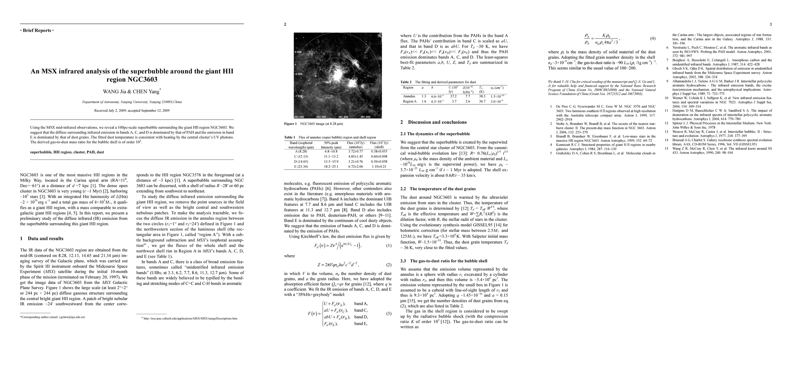 A study using MSX mid-infrared observations reveals a 100 pc-scale superbubble surrounding NGC3603, with distinct characteristics of PAH and dust grains dominating the infrared emission in different bands.