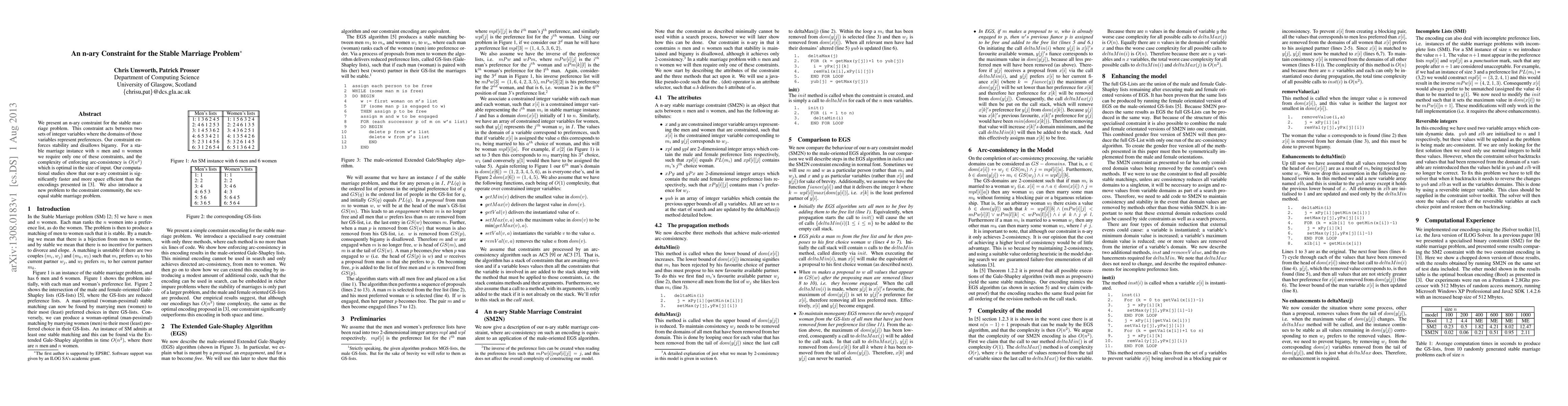 This paper introduces an efficient n-ary constraint for solving the stable marriage problem, enforcing stability and preventing bigamy with optimal $O(n^2)$ arc-consistency complexity. Computational studies demonstrate its superior speed and space efficiency compared to previous methods.