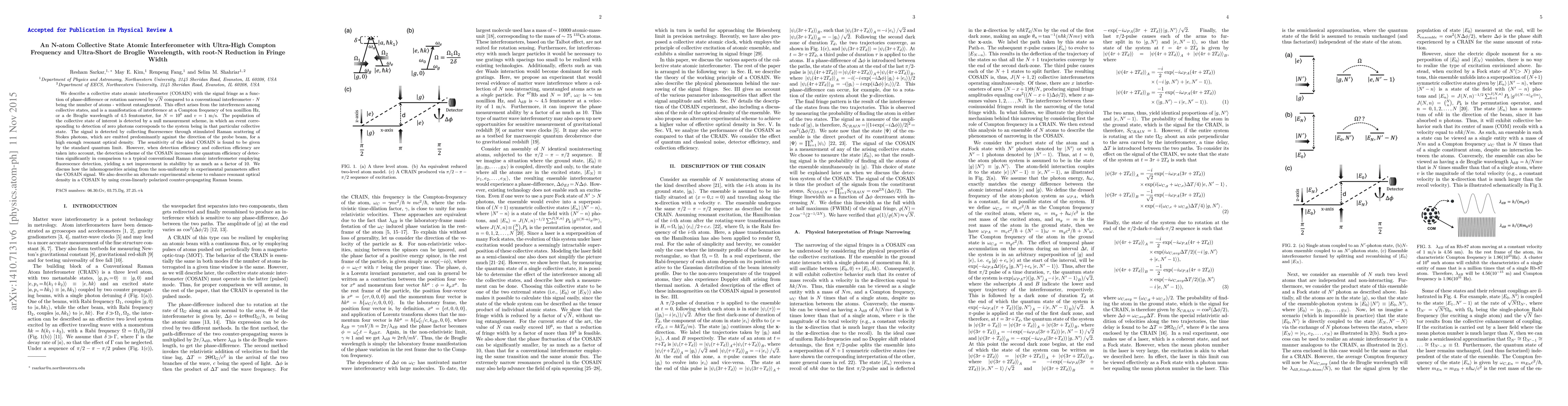 We describe a collective state atomic interferometer (COSAIN) with the signal fringe as a function of phase-difference or rotation narrowed by $\sqrt{N}$ compared to a conventional interferometer - $N$ being the number of atoms - without entanglement. This effect arises from the interferences among collective states, and is a manifestation of interference at a Compton frequency of ten nonillion Hz, or a de Broglie wavelength of ten attometer, for $N=10^6$ and $v = 300 m/s$. The population of the collective state of interest is detected by a null measurement scheme, in which an event corresponding to detection of zero photons corresponds to the system being in that particular collective state. The signal is detected by collecting fluorescence through stimulated Raman scattering of Stokes photons, which are emitted predominantly against the direction of the probe beam, for a high enough resonant optical density. The sensitivity of the ideal COSAIN is found to be given by the standard quantum limit. However, when detection efficiency and collection efficiency are taken into account, the detection scheme of the COSAIN increases the quantum efficiency of detection significantly in comparison to a typical conventional Raman atomic interferometer employing fluorescence detection, yielding a net improvement in stability by as much as a factor of $10$. We discuss how the inhomogeneities arising from the non-uniformity in experimental parameters affect the COSAIN signal. We also describe an alternate experimental scheme to enhance resonant optical density in a COSAIN by using cross-linearly polarized counter-propagating Raman beams.