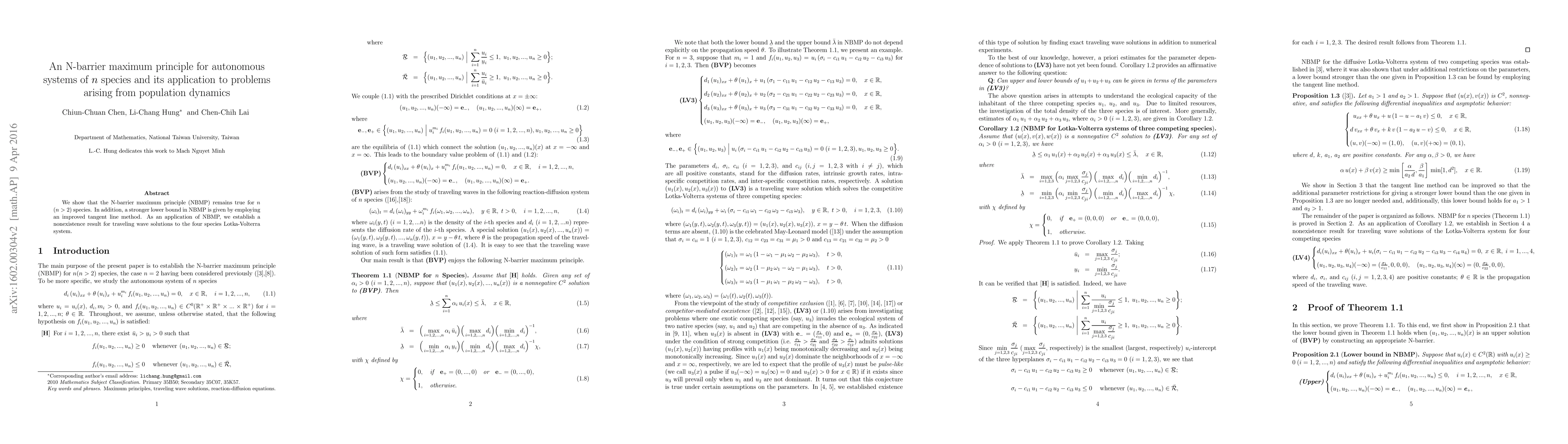 This paper proves the N-barrier maximum principle (NBMP) for autonomous systems of $n$ species ($n>2$) and introduces an improved tangent line method for a stronger lower bound. It applies NBMP to demonstrate the nonexistence of traveling wave solutions in a four-species Lotka-Volterra system.