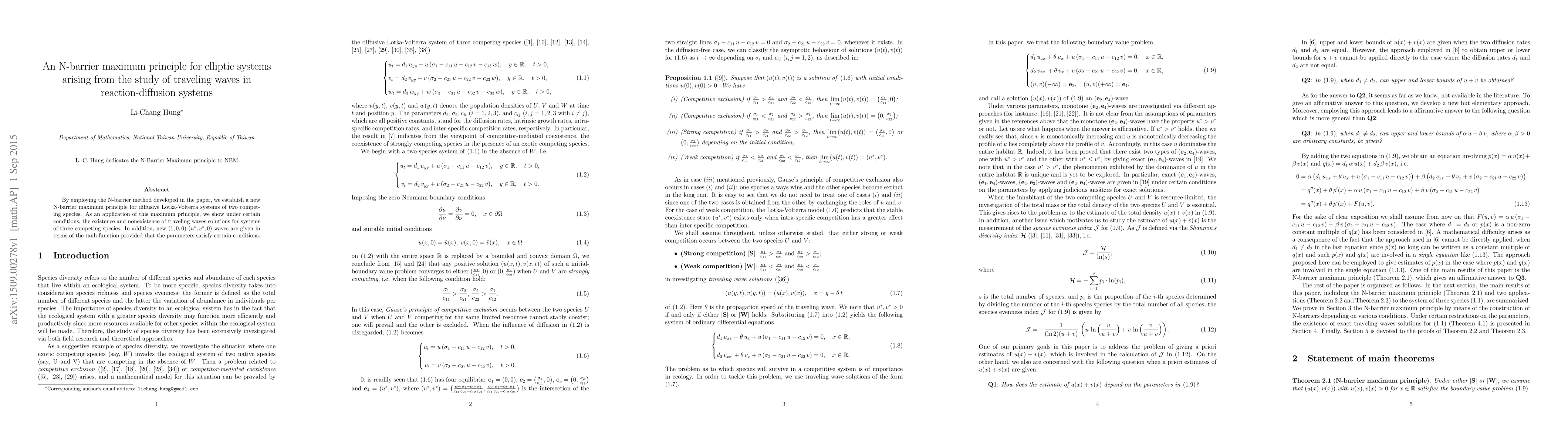 This paper establishes a new N-barrier maximum principle for diffusive Lotka-Volterra systems, demonstrating its application in proving the existence and nonexistence of traveling wave solutions for systems of three competing species, and introduces new $(1,0,0)$-$(u^{\ast},v^{\ast},0)$ waves expressed via the tanh function.