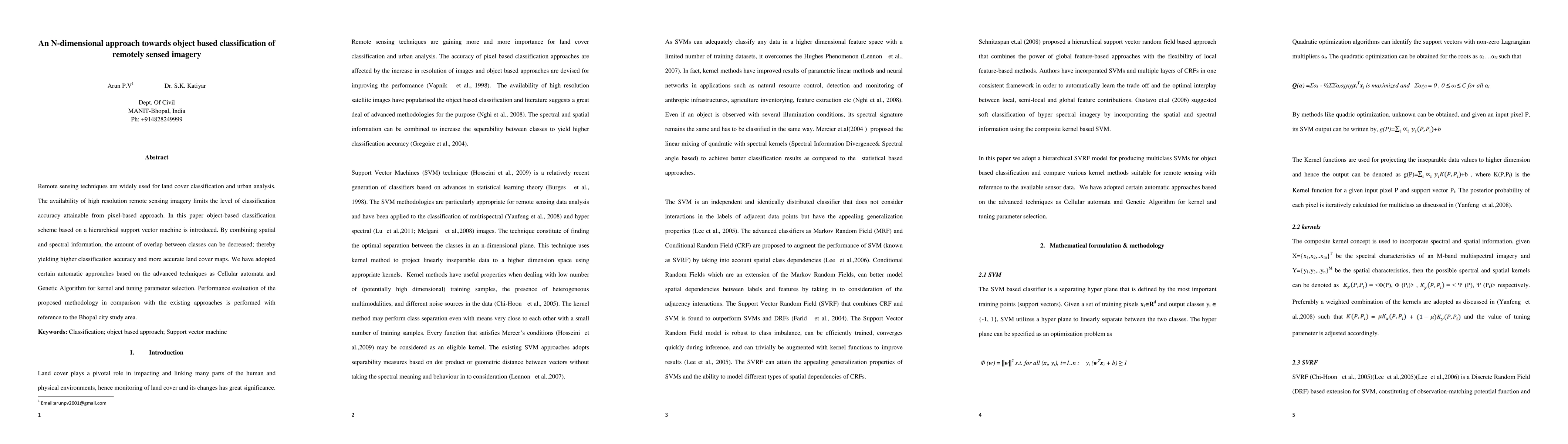Remote sensing techniques are widely used for land cover classification and urban analysis. The availability of high resolution remote sensing imagery limits the level of classification accuracy attainable from pixel-based approach. In this paper object-based classification scheme based on a hierarchical support vector machine is introduced. By combining spatial and spectral information, the amount of overlap between classes can be decreased; thereby yielding higher classification accuracy and more accurate land cover maps. We have adopted certain automatic approaches based on the advanced techniques as Cellular automata and Genetic Algorithm for kernel and tuning parameter selection. Performance evaluation of the proposed methodology in comparison with the existing approaches is performed with reference to the Bhopal city study area.