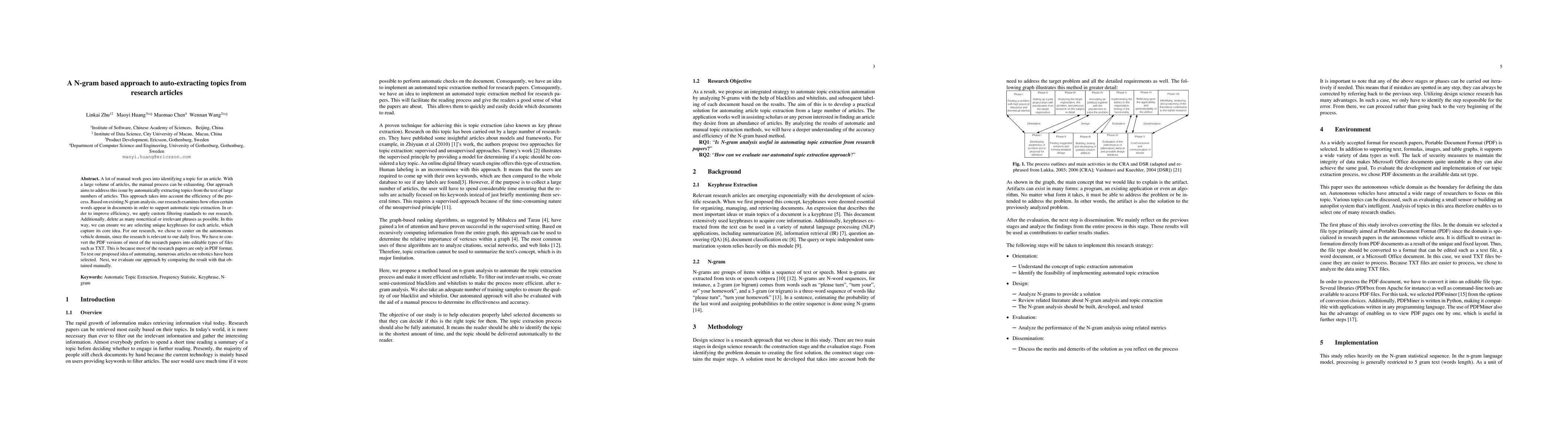 A lot of manual work goes into identifying a topic for an article. With a large volume of articles, the manual process can be exhausting. Our approach aims to address this issue by automatically extracting topics from the text of large Numbers of articles. This approach takes into account the efficiency of the process. Based on existing N-gram analysis, our research examines how often certain words appear in documents in order to support automatic topic extraction. In order to improve efficiency, we apply custom filtering standards to our research. Additionally, delete as many noncritical or irrelevant phrases as possible. In this way, we can ensure we are selecting unique keyphrases for each article, which capture its core idea. For our research, we chose to center on the autonomous vehicle domain, since the research is relevant to our daily lives. We have to convert the PDF versions of most of the research papers into editable types of files such as TXT. This is because most of the research papers are only in PDF format. To test our proposed idea of automating, numerous articles on robotics have been selected. Next, we evaluate our approach by comparing the result with that obtained manually.