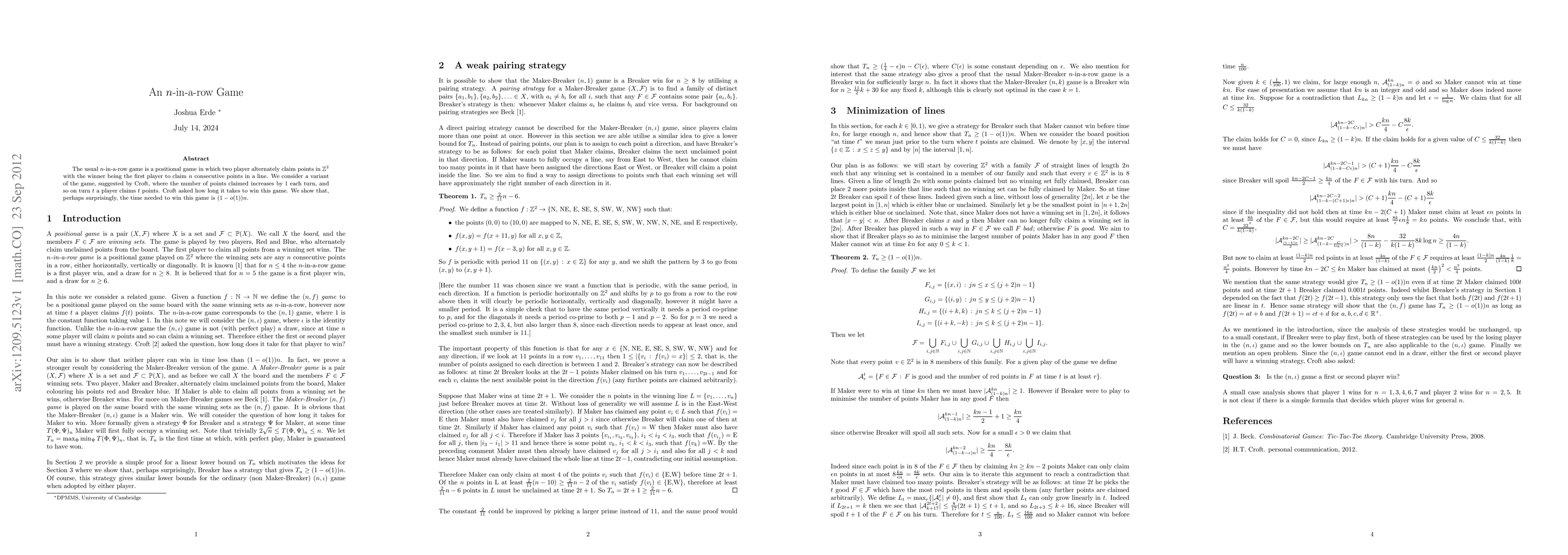 The paper explores a variant of the $n$-in-a-row game where players claim an increasing number of points each turn, and determines that the winning time is asymptotically $(1-o(1))n$. This result reveals a surprisingly efficient winning strategy in the modified game.