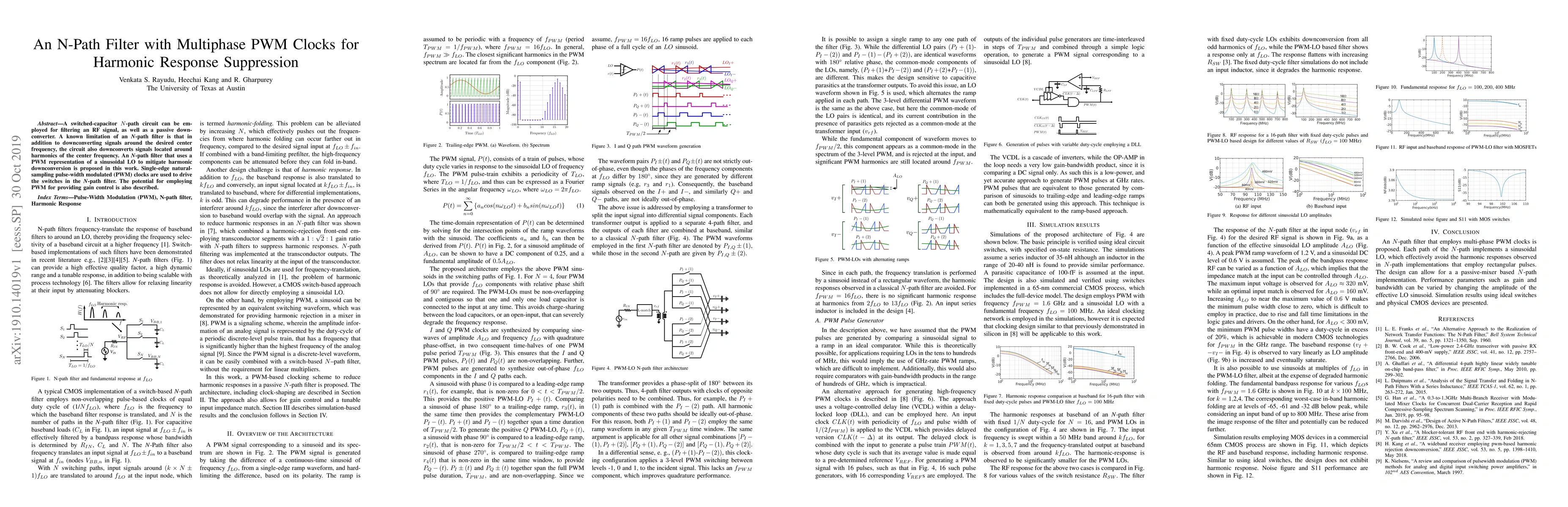 A switched-capacitor N-path circuit can be employed for filtering an RF signal, as well as a passive downconverter. A known limitation of an N-path filter is that in addition to downconverting signals around the desired center frequency, the circuit also downconverts signals located around harmonics of the center frequency. An N-path filter that uses a PWM representation of a sinusoidal LO to mitigate harmonic downconversion is proposed in this work. Single-edge natural sampling pulse-width modulated (PWM) clocks are used to drive the switches in the N-path filter. The potential for employing PWM for providing gain control is also described.