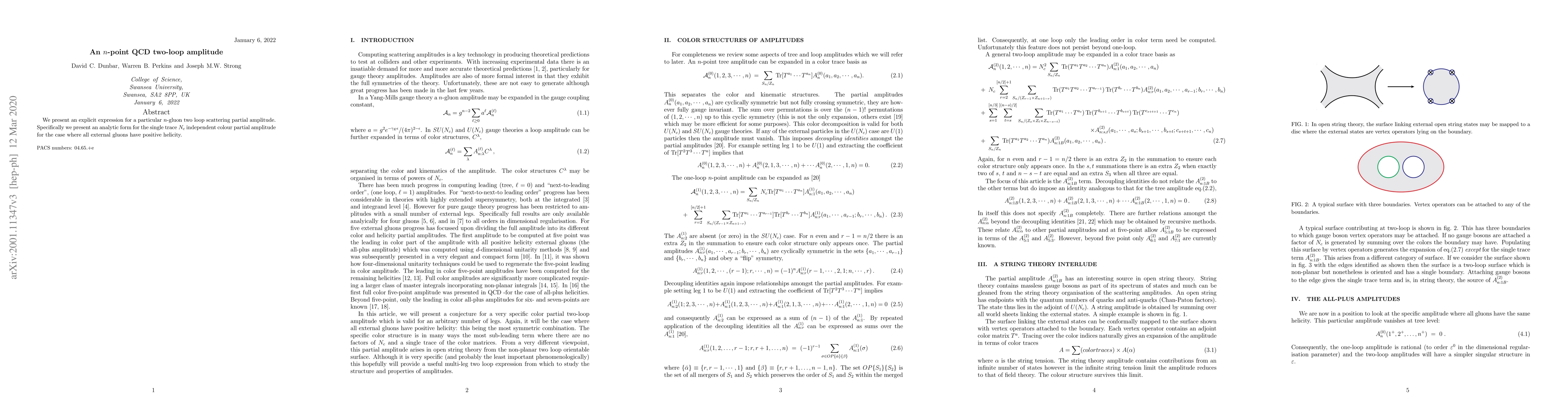 We present an explicit expression for a particular $n$-gluon two loop scattering partial amplitude. Specifically we present an analytic form for the single trace $N_c$ independent colour partial amplitude for the case where all external gluons have positive helicity.